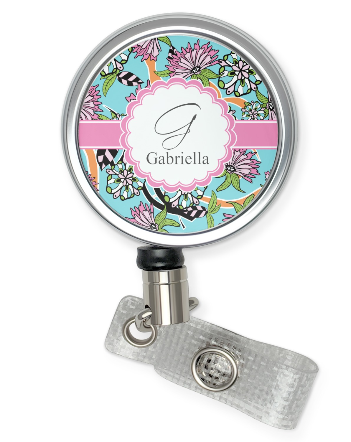 The flowers in this design are colored in two different shades of pink, lime green, and sky blue and are trimmed in black to make them pop out up against a sky blue background. The design has a classic ribbon in light pink trimmed in white. The decorative scalloped label is in white and trimmed in the light pink and white. Add an initial and a name for that personal touch to pull the entire design together.