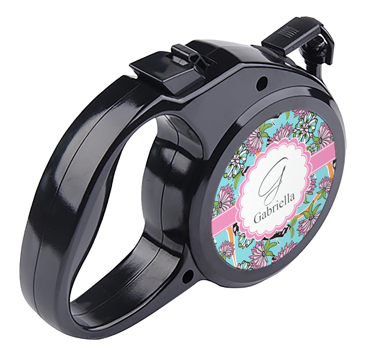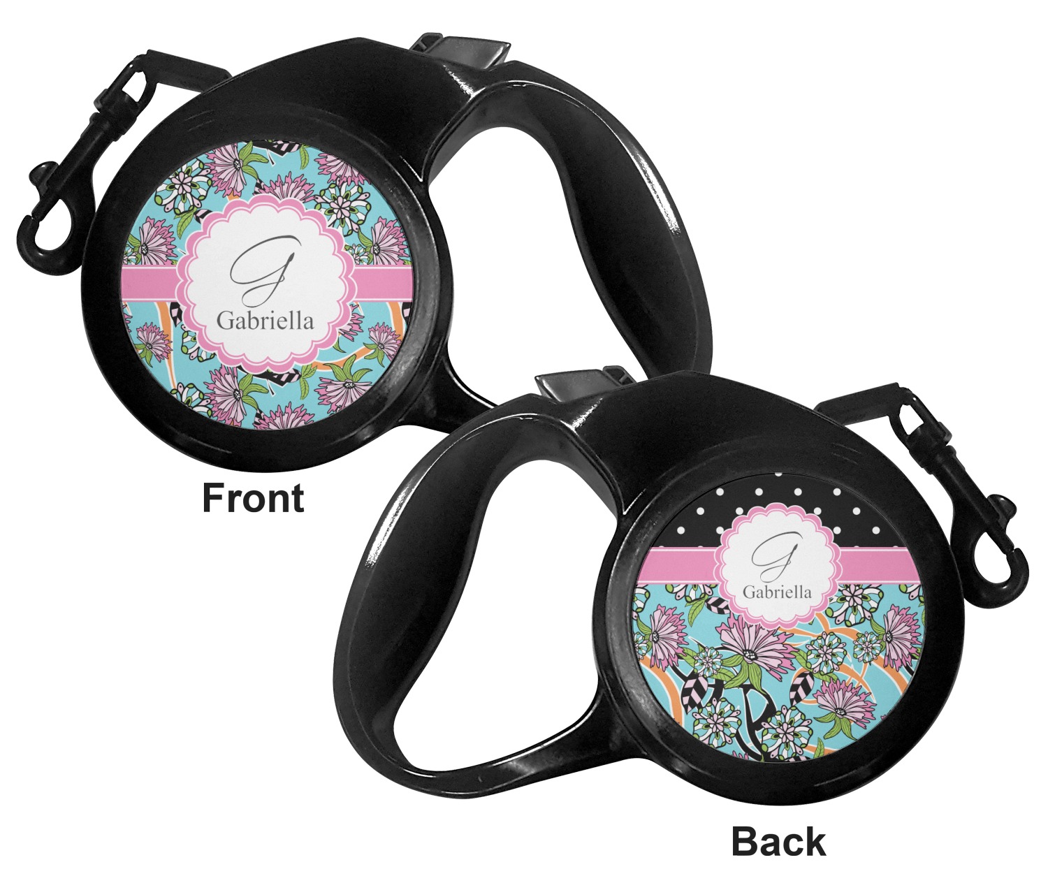The leash's plastic handle is accommodating of your grip and displays your customization on both sides. The dog leash also features the traditional bolt snap clip, for easy fastening to your dog's collar. The leash and leash handle themselves are both black in color.