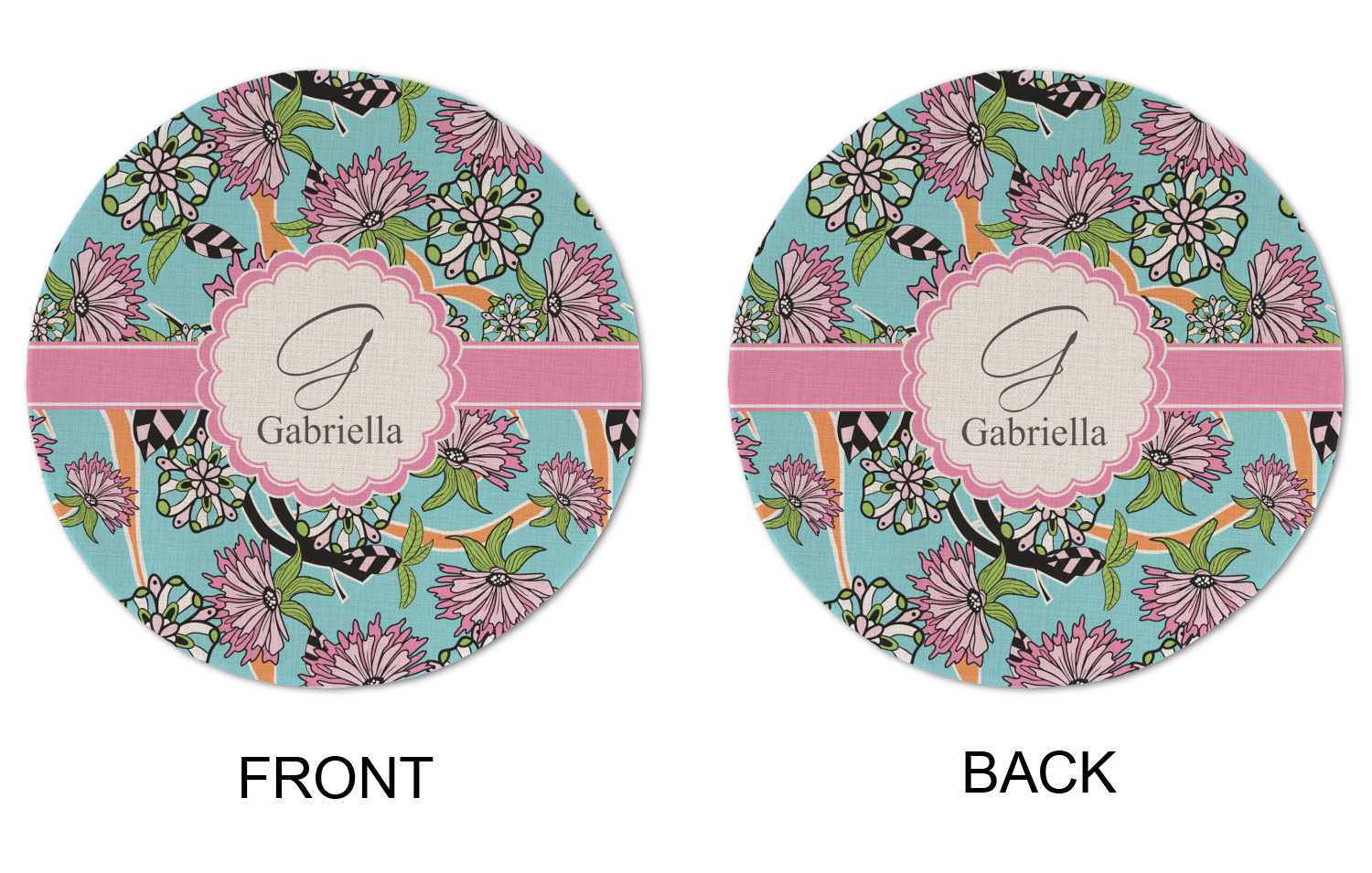 The flowers in this design are colored in two different shades of pink, lime green, and sky blue and are trimmed in black to make them pop out up against a sky blue background. The design has a classic ribbon in light pink trimmed in white. The decorative scalloped label is in white and trimmed in the light pink and white. Add an initial and a name for that personal touch to pull the entire design together.