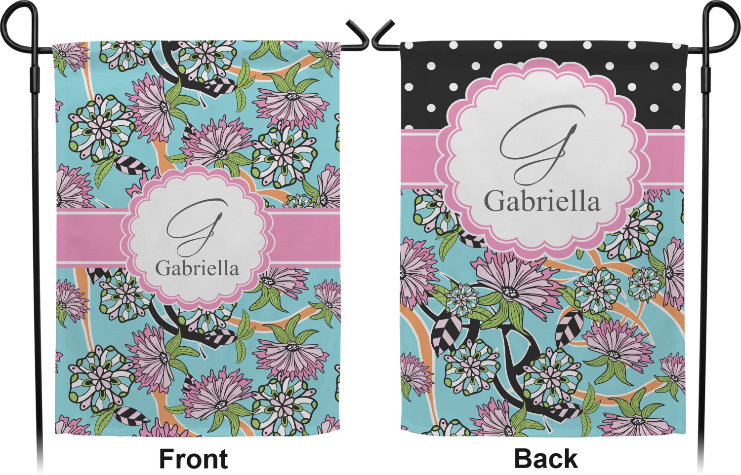 These custom garden flags are made of a durable, double-ply, polyester weave, allowing them to withstand the elements year round. The small flags measure at approximately 12 by 18 inches. The large flags measure out to 28 by 37 inches. You can order these decorative flags with your customization printed on the front only, or the front and back.