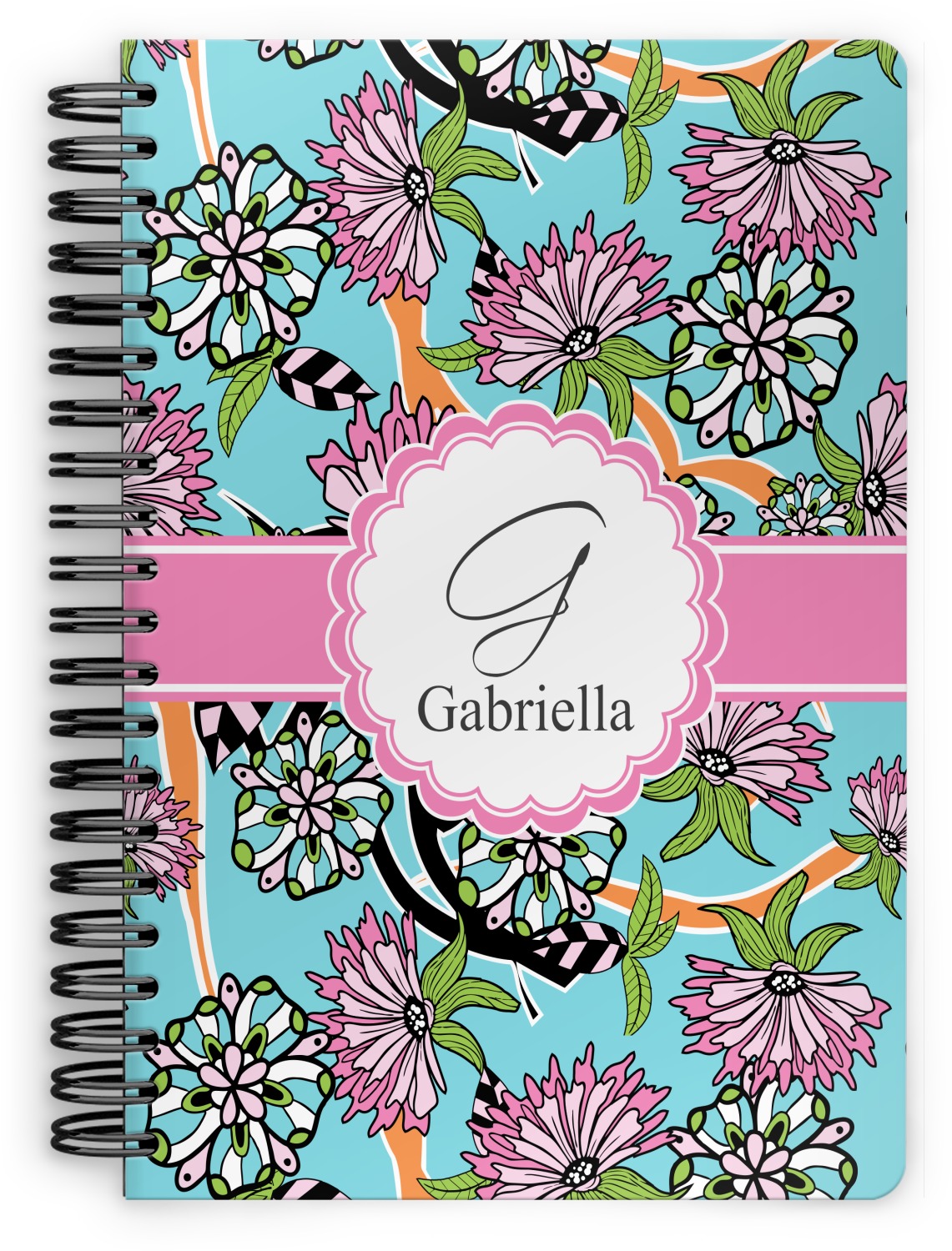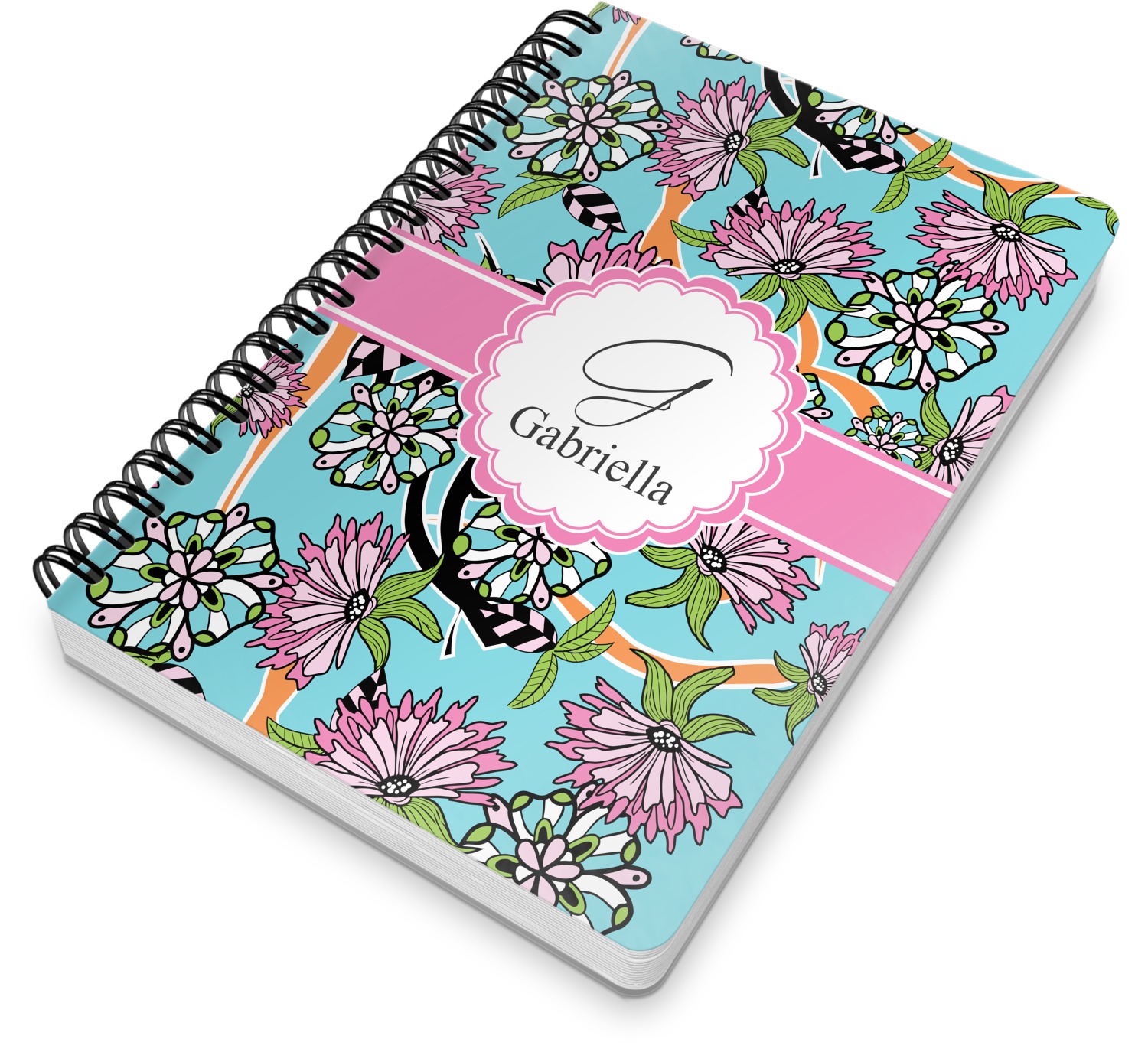 This spiral notebook includes 75 sheets of thick, ruled paper. The front and back of this custom notebook is made of a robust, laminate, plastic covering. We print your personalization on these two panels, underneath a glossy finish, which emphasizes the colors of your design. The two panels and the sheets of paper are held together by a sturdy, black coil. The paper within your bound notebook is perforated for easy, clean tearing.