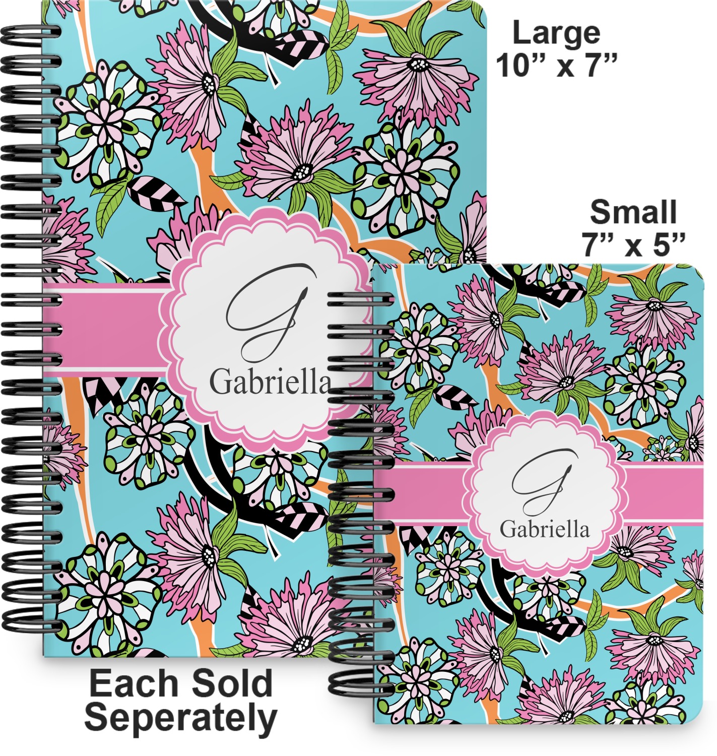 This spiral journal is available in two sizes. The first size is more suitable for a tote or purse and measures at 7" x 5". The second option is a bit larger, at 10" x 7", and is a better fit for a briefcase or backpack.