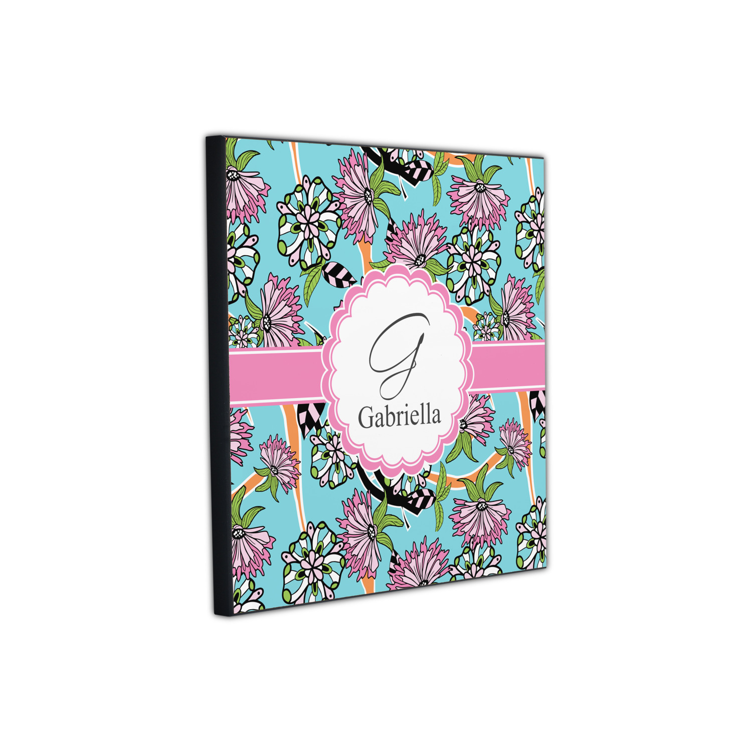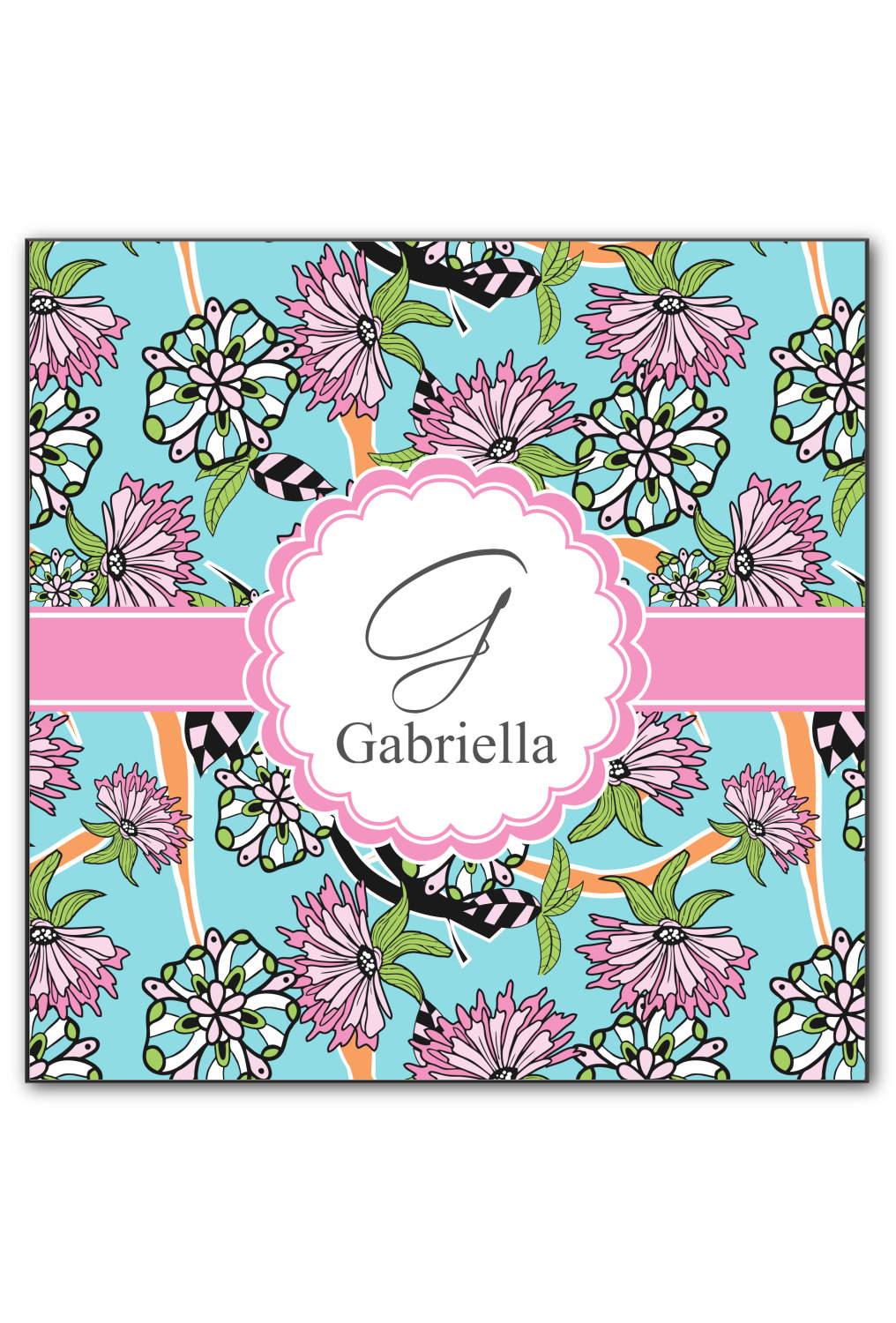 The flowers in this design are colored in two different shades of pink, lime green, and sky blue and are trimmed in black to make them pop out up against a sky blue background. The design has a classic ribbon in light pink trimmed in white. The decorative scalloped label is in white and trimmed in the light pink and white. Add an initial and a name for that personal touch to pull the entire design together.