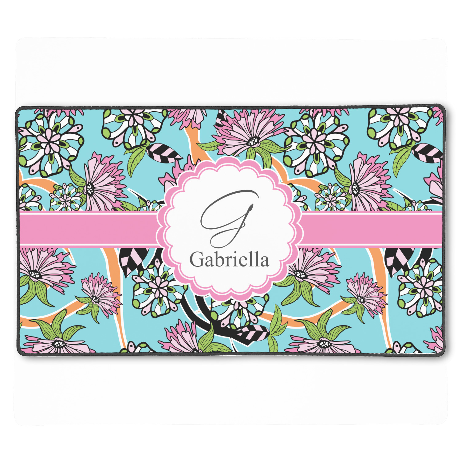 The flowers in this design are colored in two different shades of pink, lime green, and sky blue and are trimmed in black to make them pop out up against a sky blue background. The design has a classic ribbon in light pink trimmed in white. The decorative scalloped label is in white and trimmed in the light pink and white. Add an initial and a name for that personal touch to pull the entire design together.