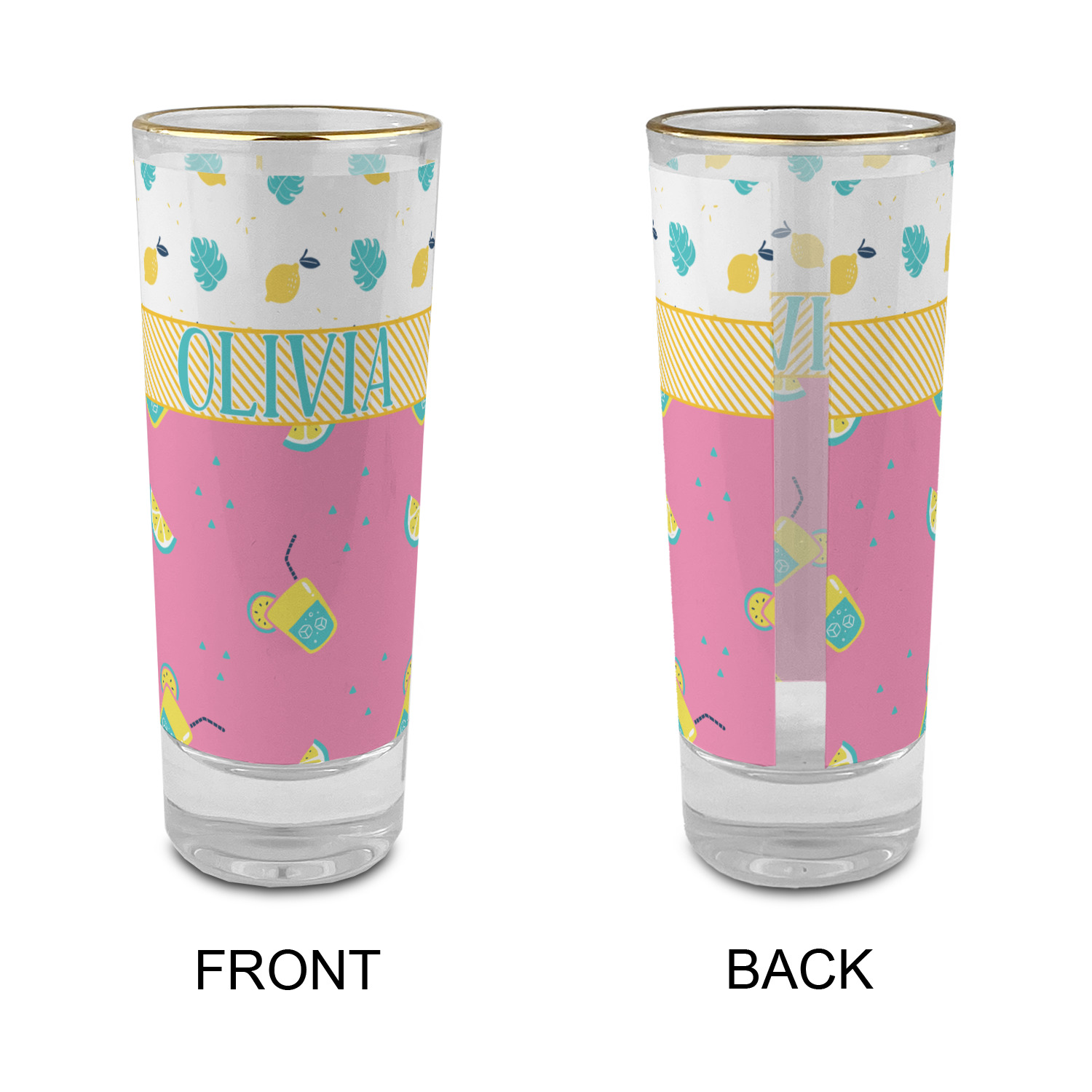 These glass shooter glasses are printed in full color with the design of your choice. These are a tall shooter 2 oz size and stand 4" tall. The print is a full wrap design to boldly display your personalization.