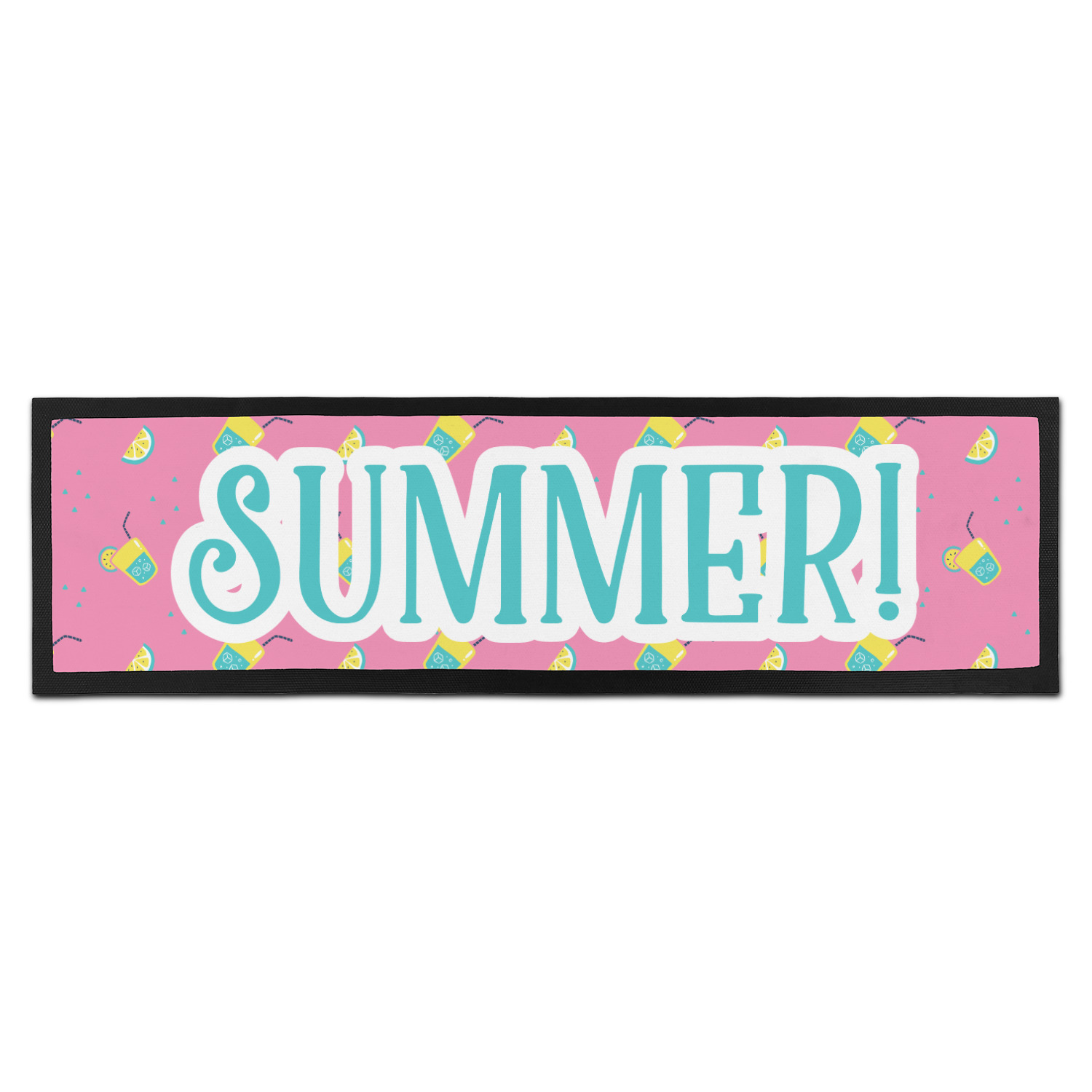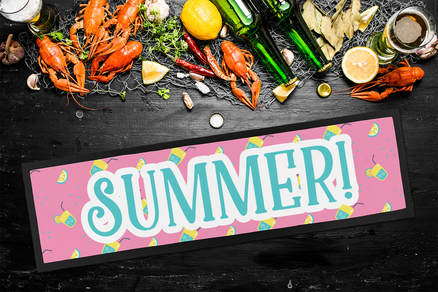 Summer Lemonade is a bold pink with pops of yellow cups of lemonade and green shapes. This is the perfect design for beach and pool gear! Get some fun flip-flops or put it on a beach towel!