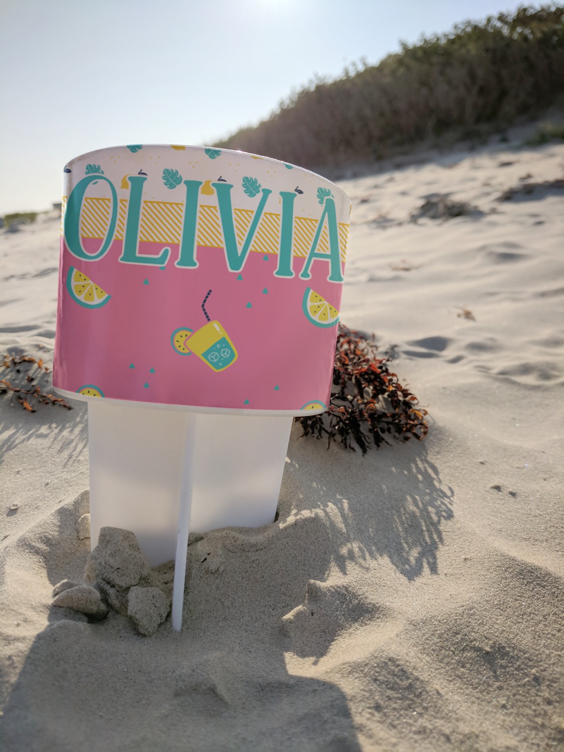 This cup holder has a large stake at its bottom that anchors it to the sand or ground below, while the cup holder rests above the stake. The entire drink holder is made of durable plastic and displays your customization around the cup holder portion. We sell these personalized beach spikers in two different colors: black and white.