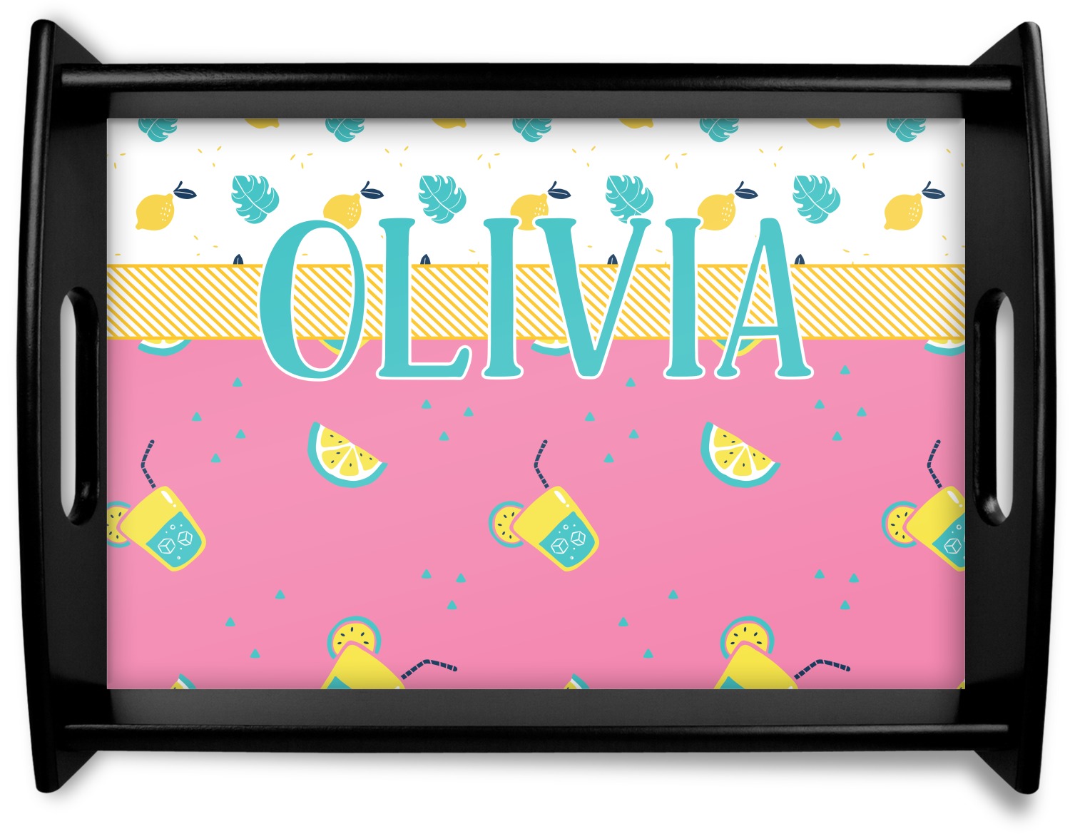 This serving tray with handles features square edges and two rounded sides, creating a very modern look. Each side is fabricated from a beautifully cut, natural wood. The bottom of the interior of the tray displays your customized design in bright, vibrant color. The tray is sold in both a black color and a natural wood look. Each variation of the wood serving tray has two sizes: Small, which is 14" x 10" x 2.25", and Large, which is 19.5" x 13.5" x 2.75".