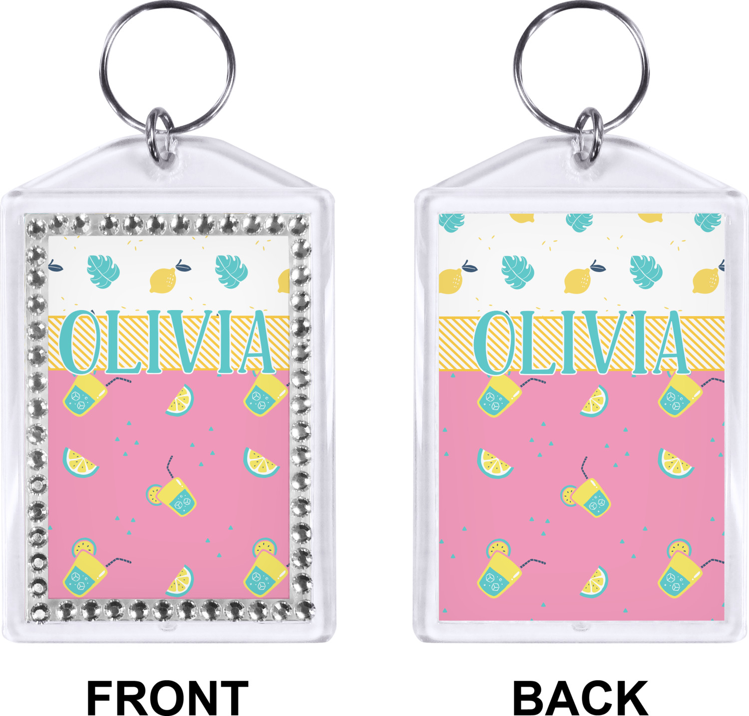 Our personalized keychains have a bold, rectangular shape, outlined by a series of shimmering rhinestones. A metal, split keyring is included with your purchase, and an additional metal hoop allows for attachment of the keychain to the split ring. This unique keychain measures at about 3.75 by 2.5 inches. We print your customized design(s) across both the back and front of this keychain.
