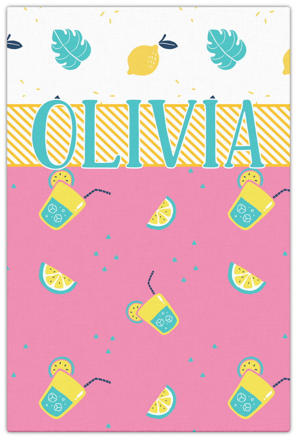 Summer Lemonade is a bold pink with pops of yellow cups of lemonade and green shapes. This is the perfect design for beach and pool gear! Get some fun flip-flops or put it on a beach towel!