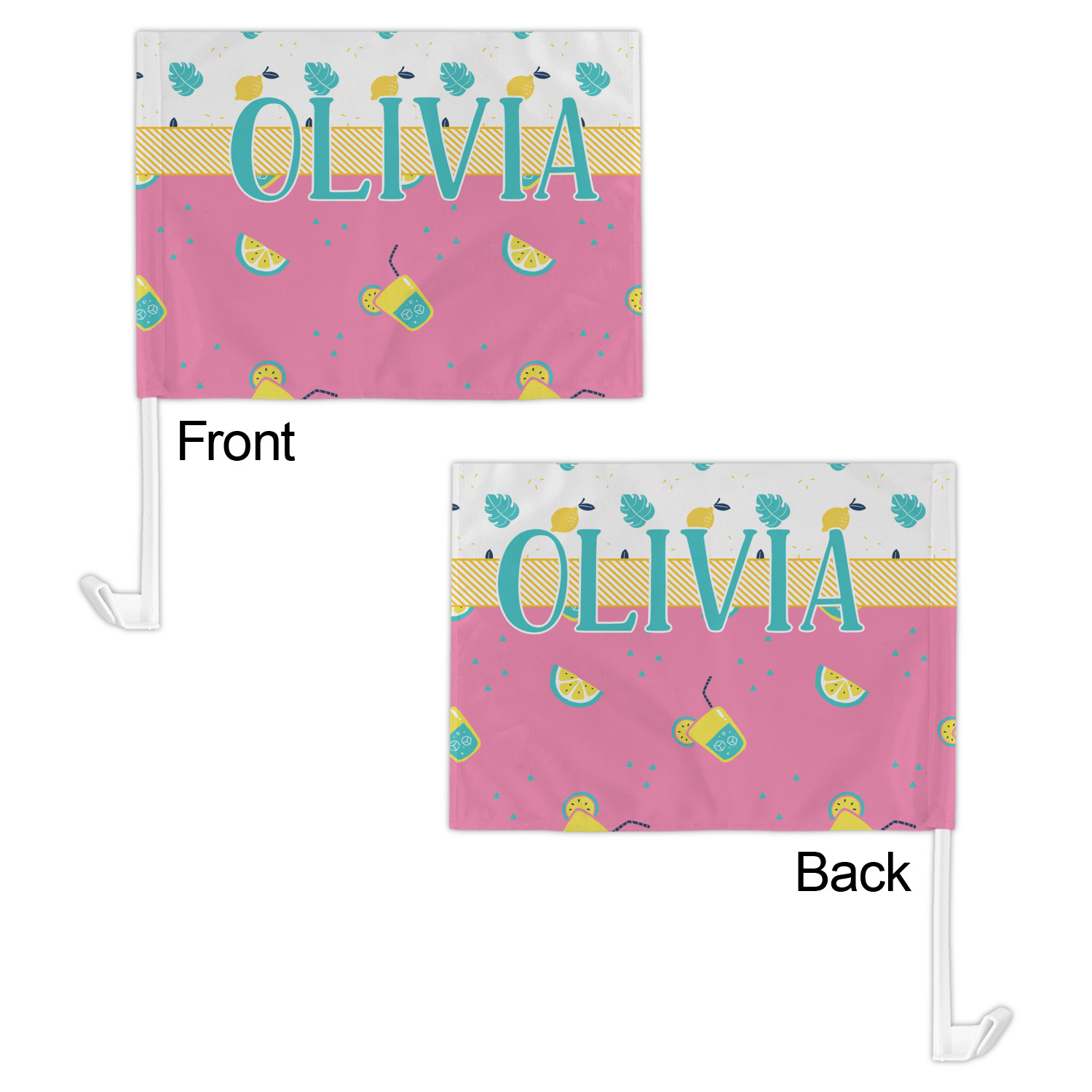 Our personalized flags are made from a durable, yet lightweight cloth that will proudly bear your logo or design of choice, while withstanding the outside elements. We have two size options - 8" x 11" and 11" x 15". Both come with a flag pole which includes a clip that secures the pole to the side window, whether it is rolled up or down. The flags are printed on both sides to display your design from all directions.