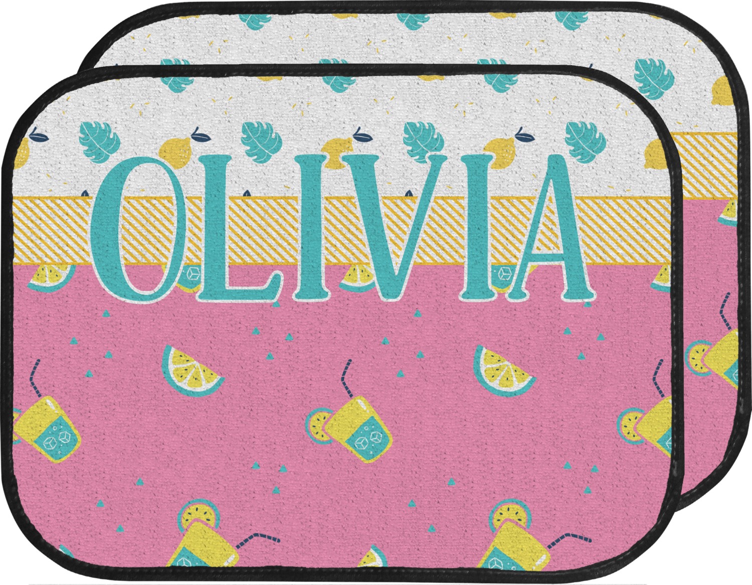 Summer Lemonade is a bold pink with pops of yellow cups of lemonade and green shapes. This is the perfect design for beach and pool gear! Get some fun flip-flops or put it on a beach towel!