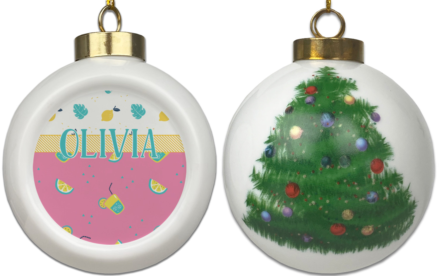 Our Christmas ornaments are a unique ceramic ball shape with a twist as it has a flat face to display your custom design! Select from one of our two design types - Christmas Tree or Poinsettia Garland - to adorn the curved back of your personal design. Each ornament measures 3H x 2.5W x 2D accompanied with a gold string accent for finishing touches to hang on your beautiful Christmas tree!