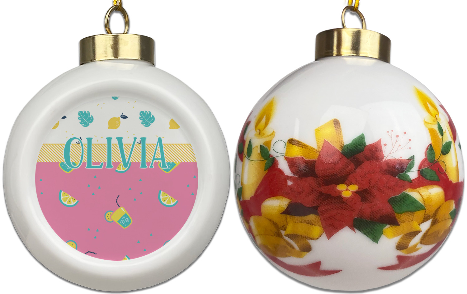 Our Christmas ornaments are a unique ceramic ball shape with a twist as it has a flat face to display your custom design! Select from one of our two design types - Christmas Tree or Poinsettia Garland - to adorn the curved back of your personal design. Each ornament measures 3H x 2.5W x 2D accompanied with a gold string accent for finishing touches to hang on your beautiful Christmas tree!