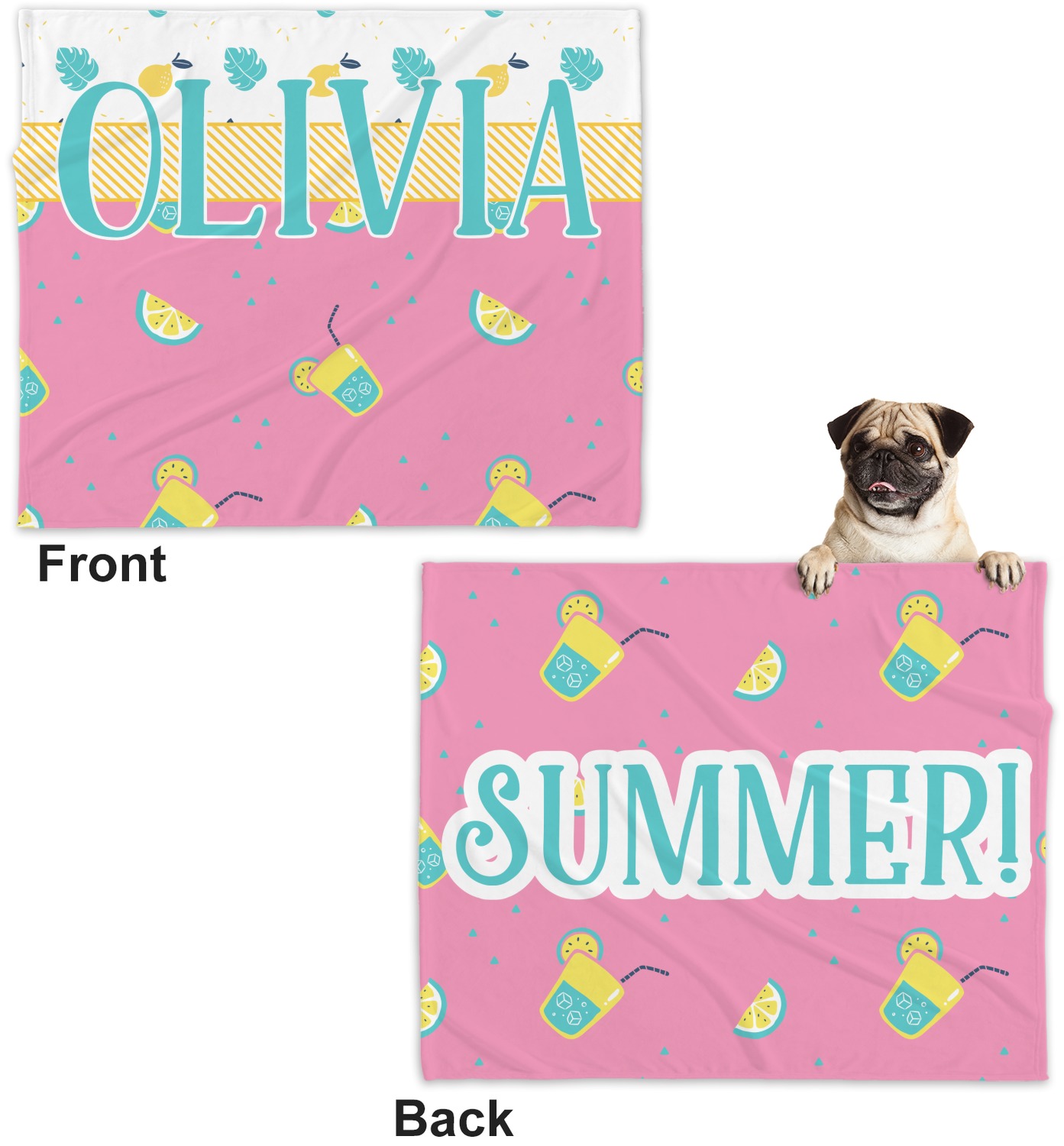 These dog blankets are crafted from a gentle, soft-to-the-touch, minky material. We print your customizations, either matching or differing, on both the top and underside of the blanket. These personalized dog blankets are available in two sizes: regular and large. Our regular size, at 40" x 30", accommodates small and some medium size dogs. At 60" x 50", our large dog blanket is a better fit for bigger breeds. Though specialized for dogs, these blankets still make a thoughtful gift for your favorite feline, or any other pet in mind!