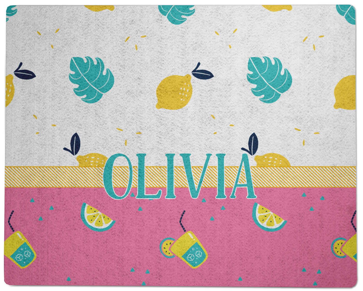 Summer Lemonade is a bold pink with pops of yellow cups of lemonade and green shapes. This is the perfect design for beach and pool gear! Get some fun flip-flops or put it on a beach towel!