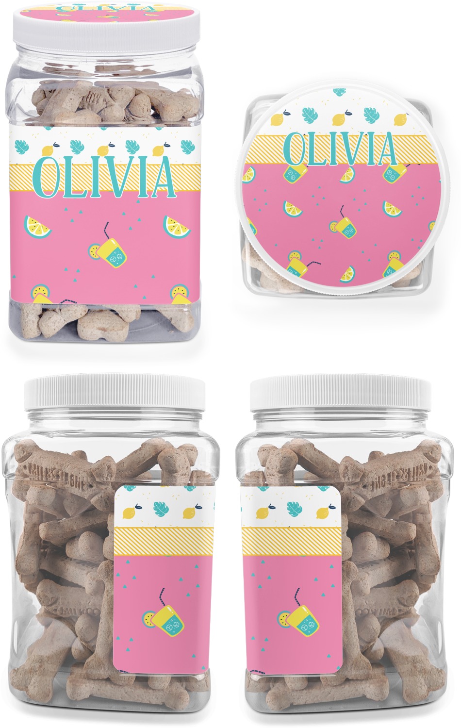 This half gallon jar, made from a sturdy plastic, is the perfect way to keep treats from any naughty pet paws, while still keeping them ready on hand for when your pup performs an impressive trick. This dog cookie jar features a screw-on, white lid that displays your personalized design on a vinyl sticker. We apply another customized sticker that wraps around the front and sides of the jar. Our dog treat jar also has indentations on the rear ends of the sides, which allows for convenient handling, and its square frame allows for easy storage.