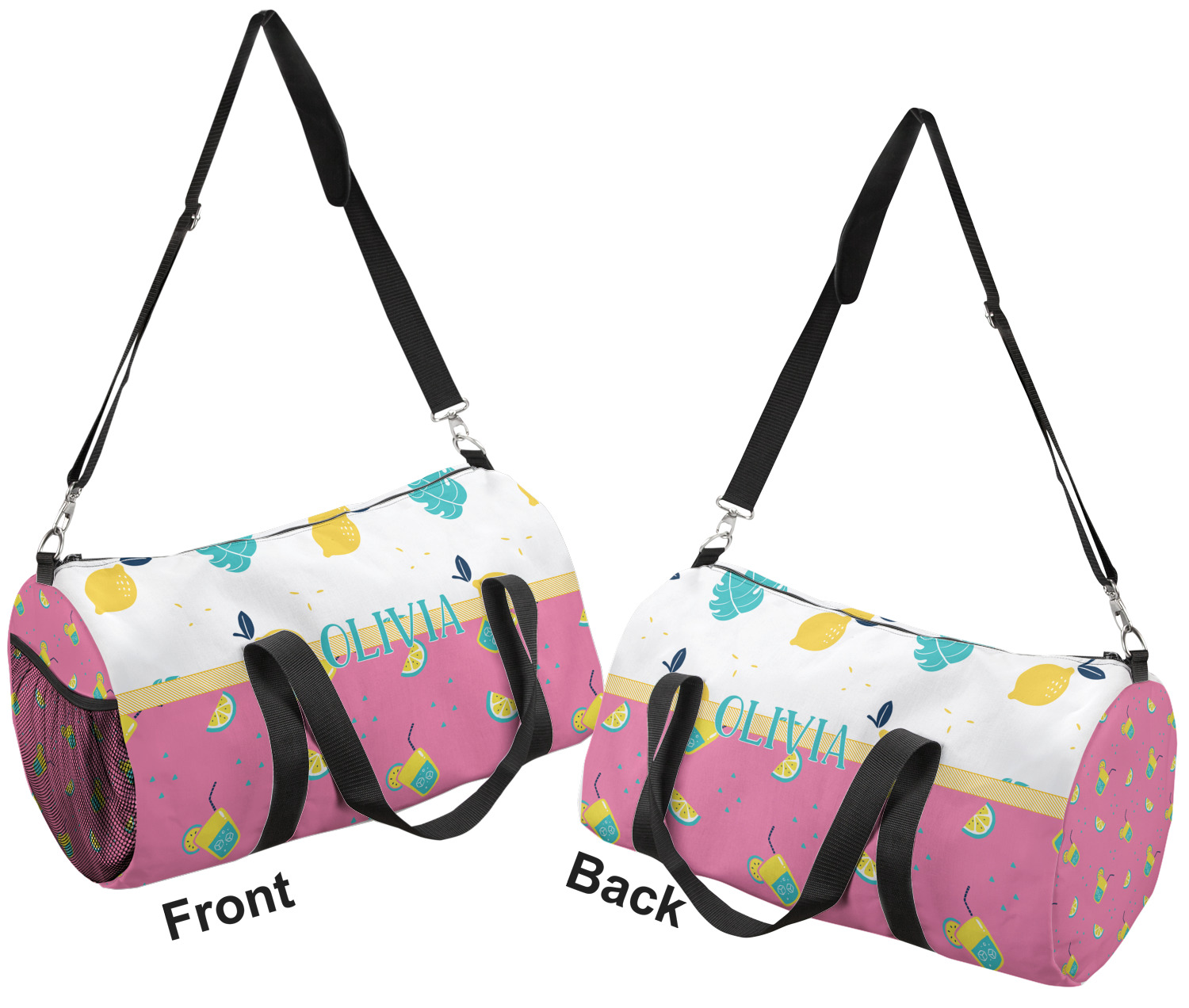 This duffle is a sturdy bag made of a canvas material. It comes in two sizes: Small (19"W x 9.5"H x 9.5"D) and Large (23"W x 12"H x 12"D). The bag is a cylindrical shape with a black adjustable strap and two handles. On one side is an elastic pouch to put a waterbottle or other small item. Your product will be sublimated with your design and is able to be designed on the front, back, and sides. Be sure to remember that the straps may cut into parts of your design if you upload your own artwork.