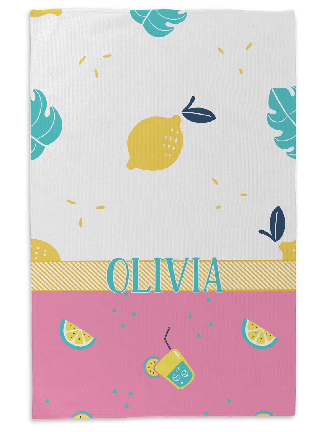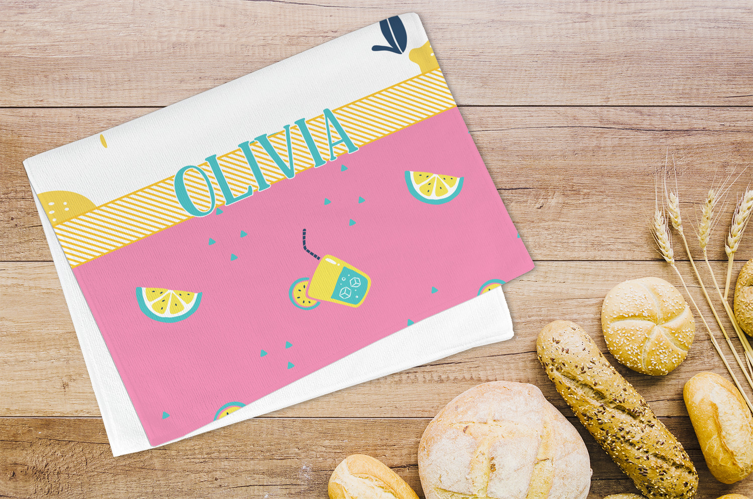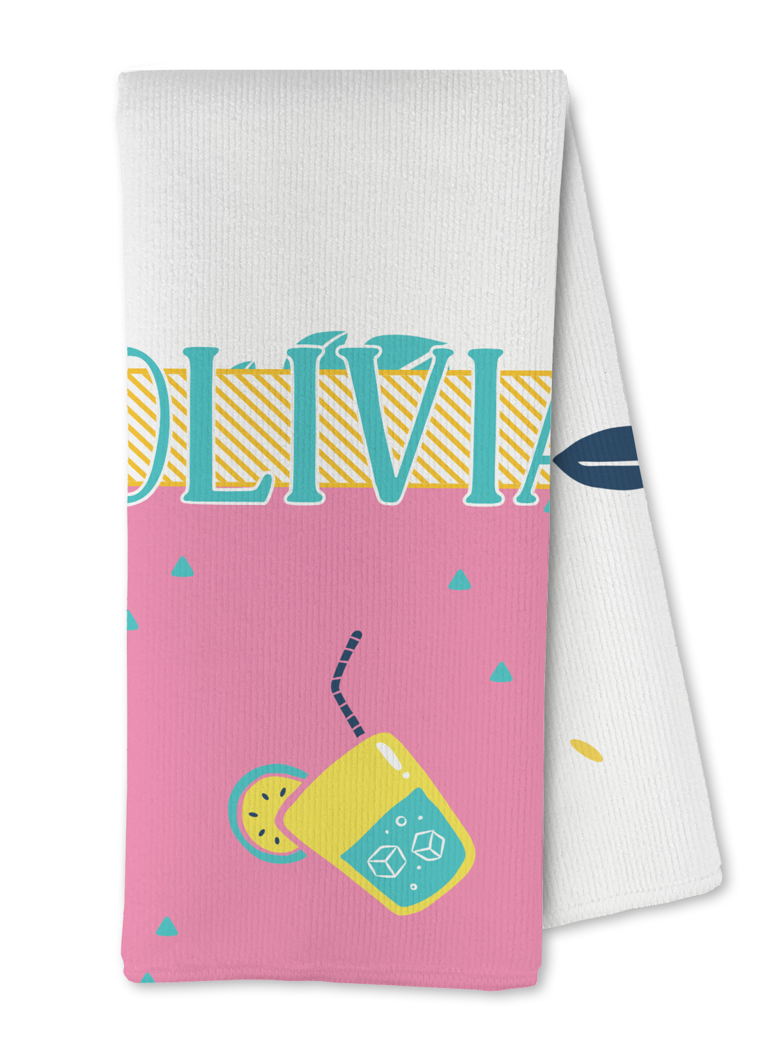 Summer Lemonade is a bold pink with pops of yellow cups of lemonade and green shapes. This is the perfect design for beach and pool gear! Get some fun flip-flops or put it on a beach towel!