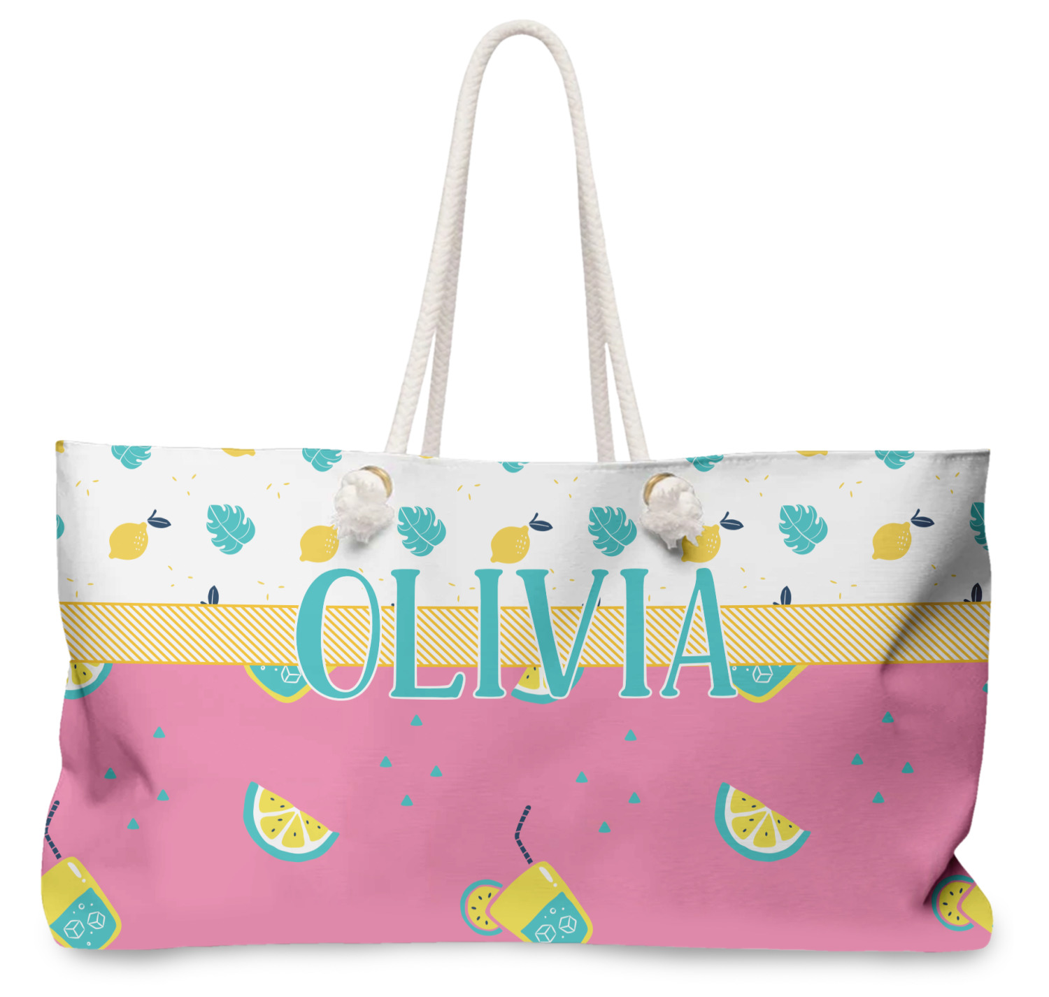 Our oversized weekender tote with rope handles is perfect for your weekend at the beach or on the town. This large tote are 24" W X 13" H, with a 5" gusset and a 27" thick rope handles with a knot that is put through a grommeted brass hole.