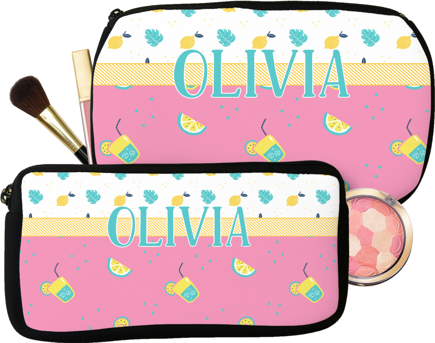 Our personalized makeup bags are available in many different designs, patterns and colors - so you are sure to find one that will love. They are made of neoprene (same material as wet-suits) and thus are water resistant, so spillages in your makeup bag will not end up all over you purse. They are customized on one side and are black on the other side and the zipper is black as well.