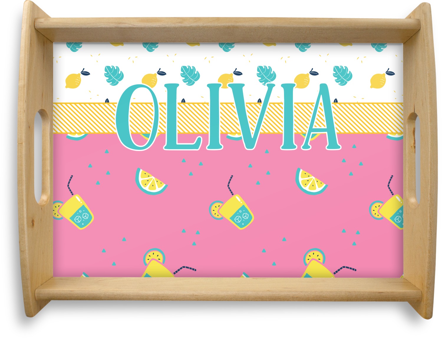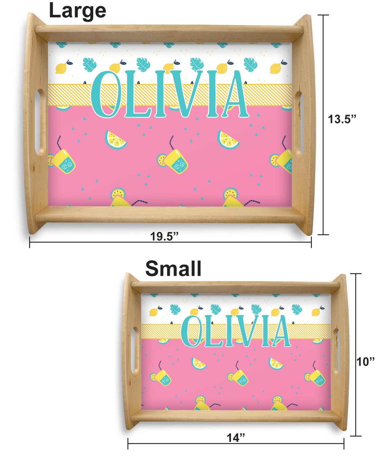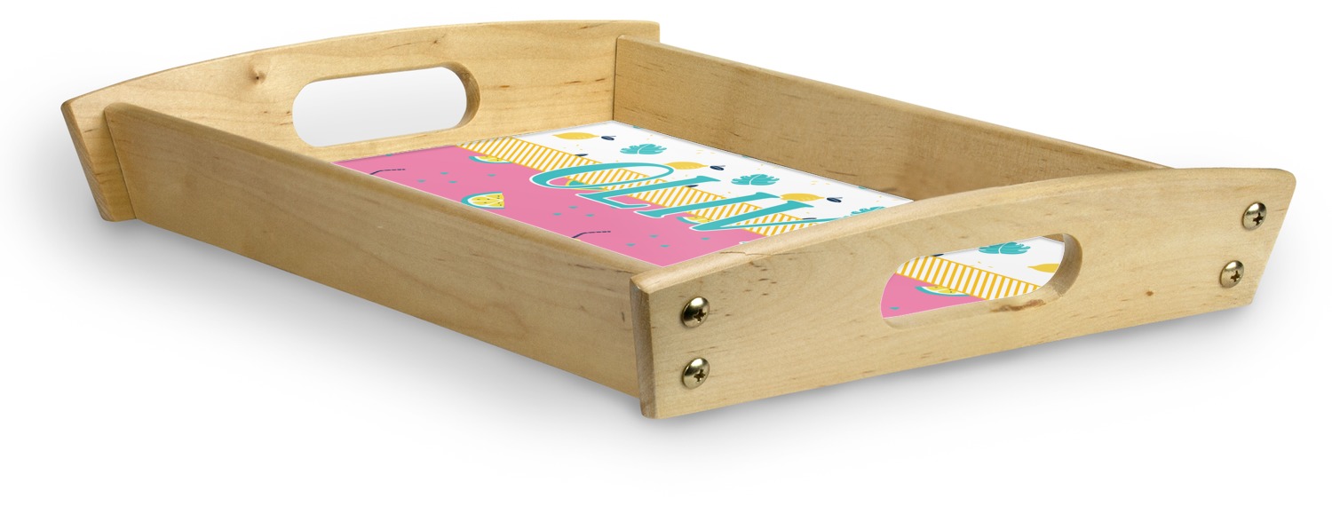This serving tray with handles features square edges and two rounded sides, creating a very modern look. Each side is fabricated from a beautifully cut, natural wood. The bottom of the interior of the tray displays your customized design in bright, vibrant color. The tray is sold in both a black color and a natural wood look. Each variation of the wood serving tray has two sizes: Small, which is 14" x 10" x 2.25", and Large, which is 19.5" x 13.5" x 2.75".