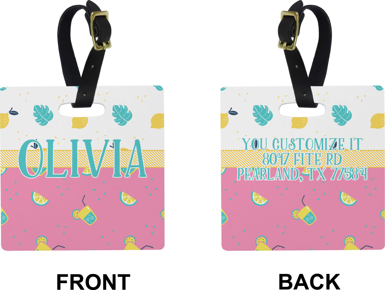 These personalized bag tags are sold in a variety of shapes, so that you may find the product that meets your vision exactly. We sell a round luggage tag, which measures at approximately 4" x 4". Our square luggage tag is about 3.5" x 3.5", while our rectangular version is 2.75" x 4 ".