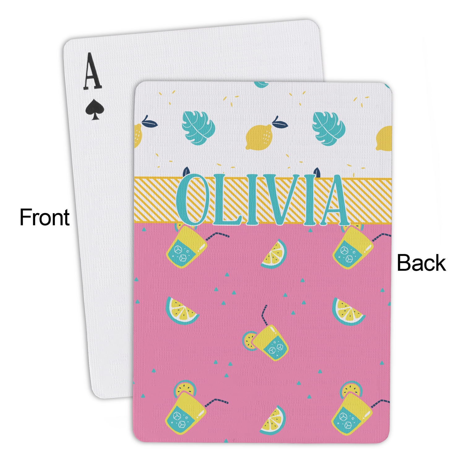 The customization / personalization is printed on the back side. The playing cards have a low gloss coating on both sides. The cards are packaged in a clear plastic box.