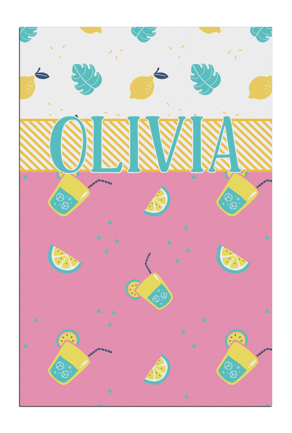 Summer Lemonade is a bold pink with pops of yellow cups of lemonade and green shapes. This is the perfect design for beach and pool gear! Get some fun flip-flops or put it on a beach towel!