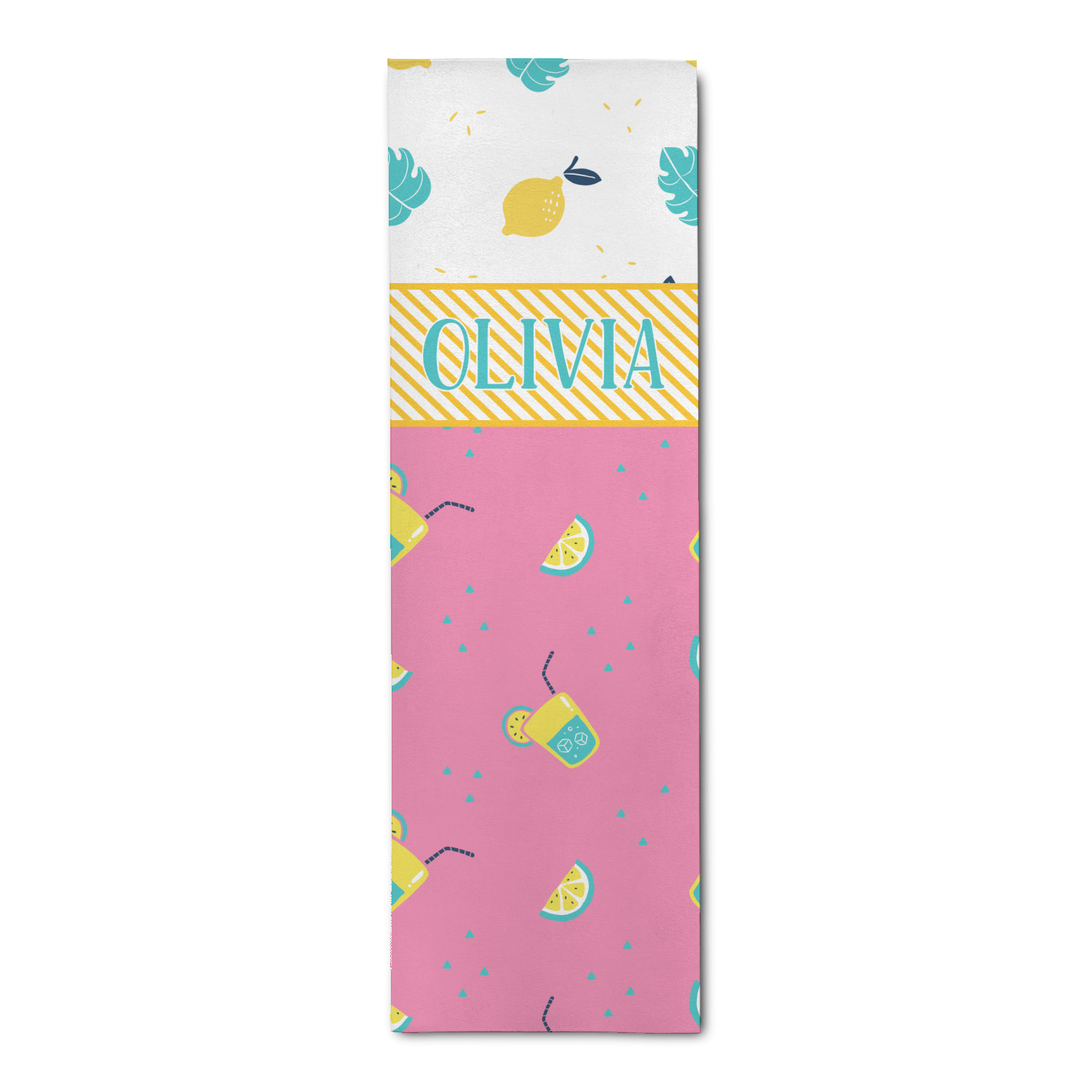 Summer Lemonade is a bold pink with pops of yellow cups of lemonade and green shapes. This is the perfect design for beach and pool gear! Get some fun flip-flops or put it on a beach towel!