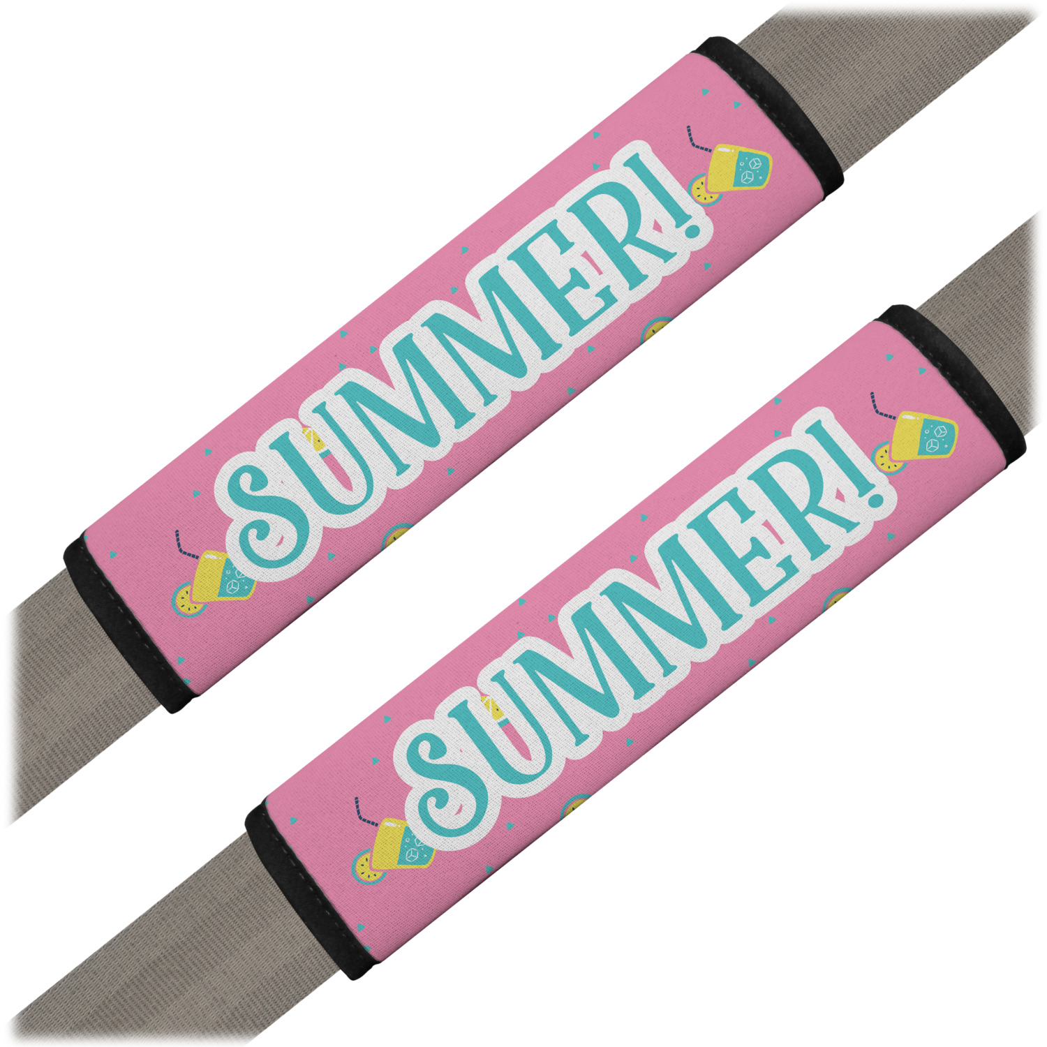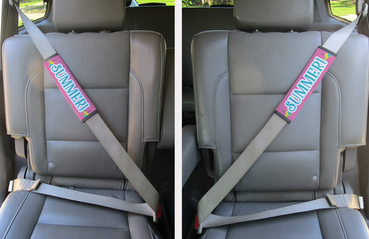 Made from neoprene, our seat belt strap covers wrap around the belt itself and have a Velcro tab for easy attachment and closure. The belt's edges are trimmed with a black polyester for a secure finish. Each cover is 9.5 by 7 inches when open and 9.5 by 2.5 inches when closed. We print your personalized design on the face of the seat belt pad.