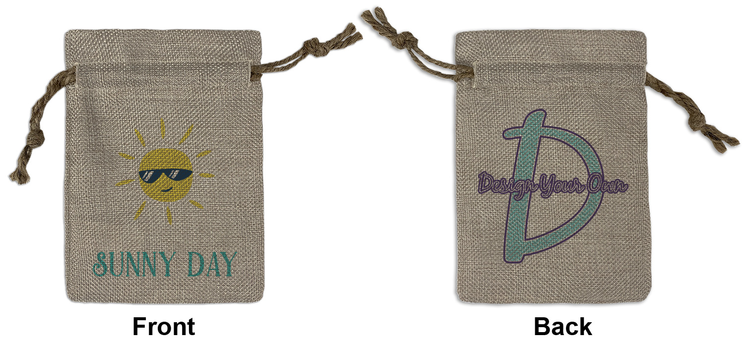 We sell our Burlap Gift Bags in 3 variant sized bags. Made with burlap polyester, each personalized bag can be secured with a twine drawstring pull. Your custom design is available to print on one side or both sides - completely up to you! The sizes of the bags measure approximately 4.5" x 6.5" for the smallest size, 6.5" x 8.0" for the medium size, and 6.5" x 13.5" for the large-sized bag.