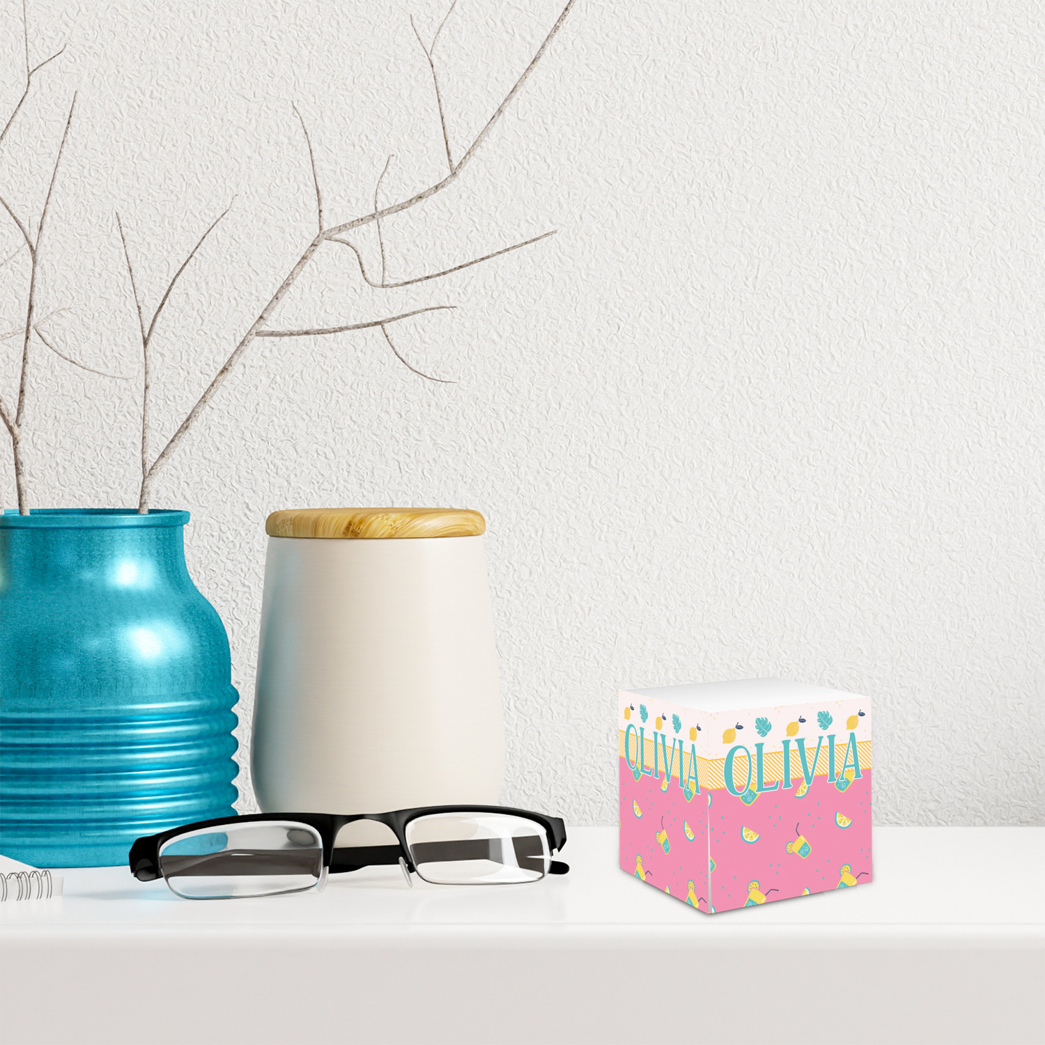 This note cube features 700 sheets of matte, white paper. Each sheet measures at 3.5 by 3.5 inches and has an adhesive strip at its top. Your personalized design is displayed on all four edges of the sticky pad.