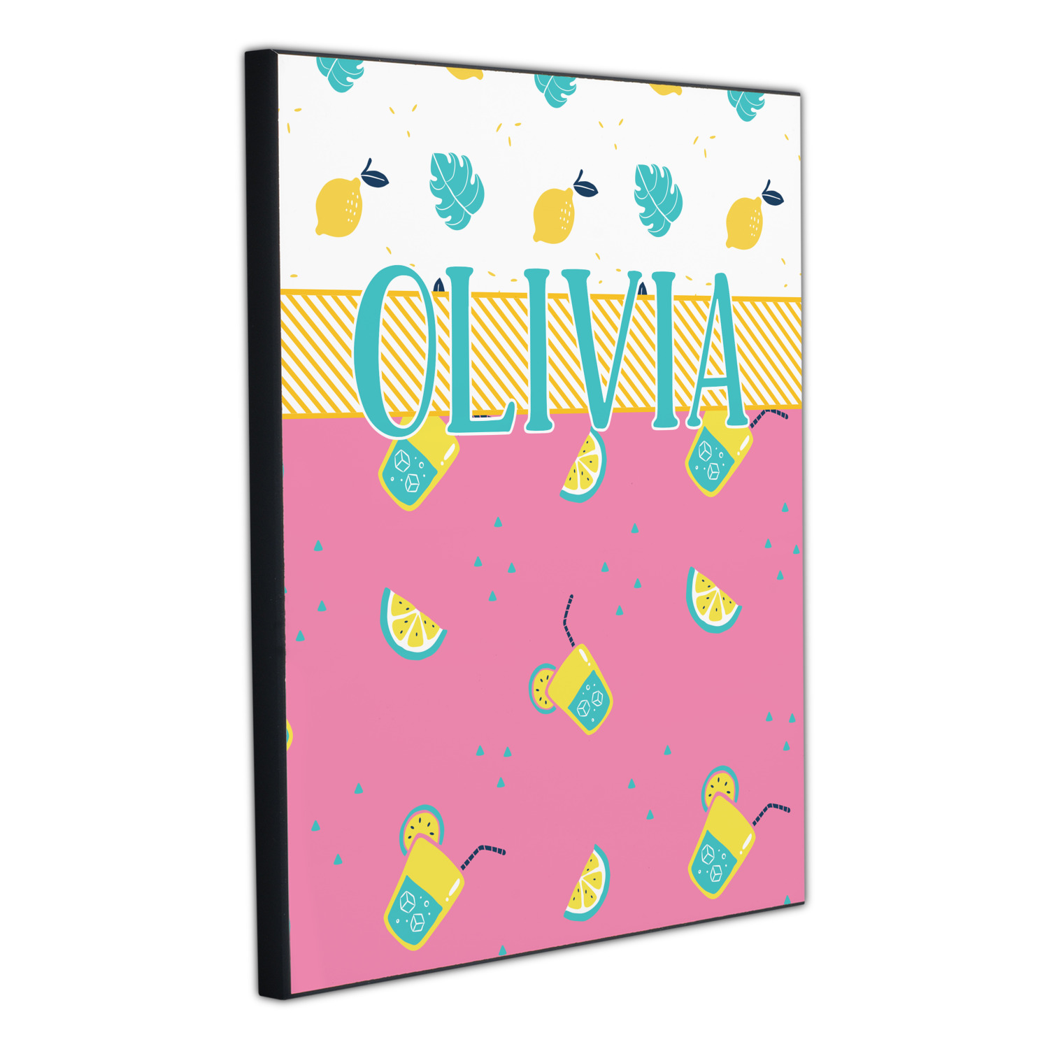 Summer Lemonade is a bold pink with pops of yellow cups of lemonade and green shapes. This is the perfect design for beach and pool gear! Get some fun flip-flops or put it on a beach towel!