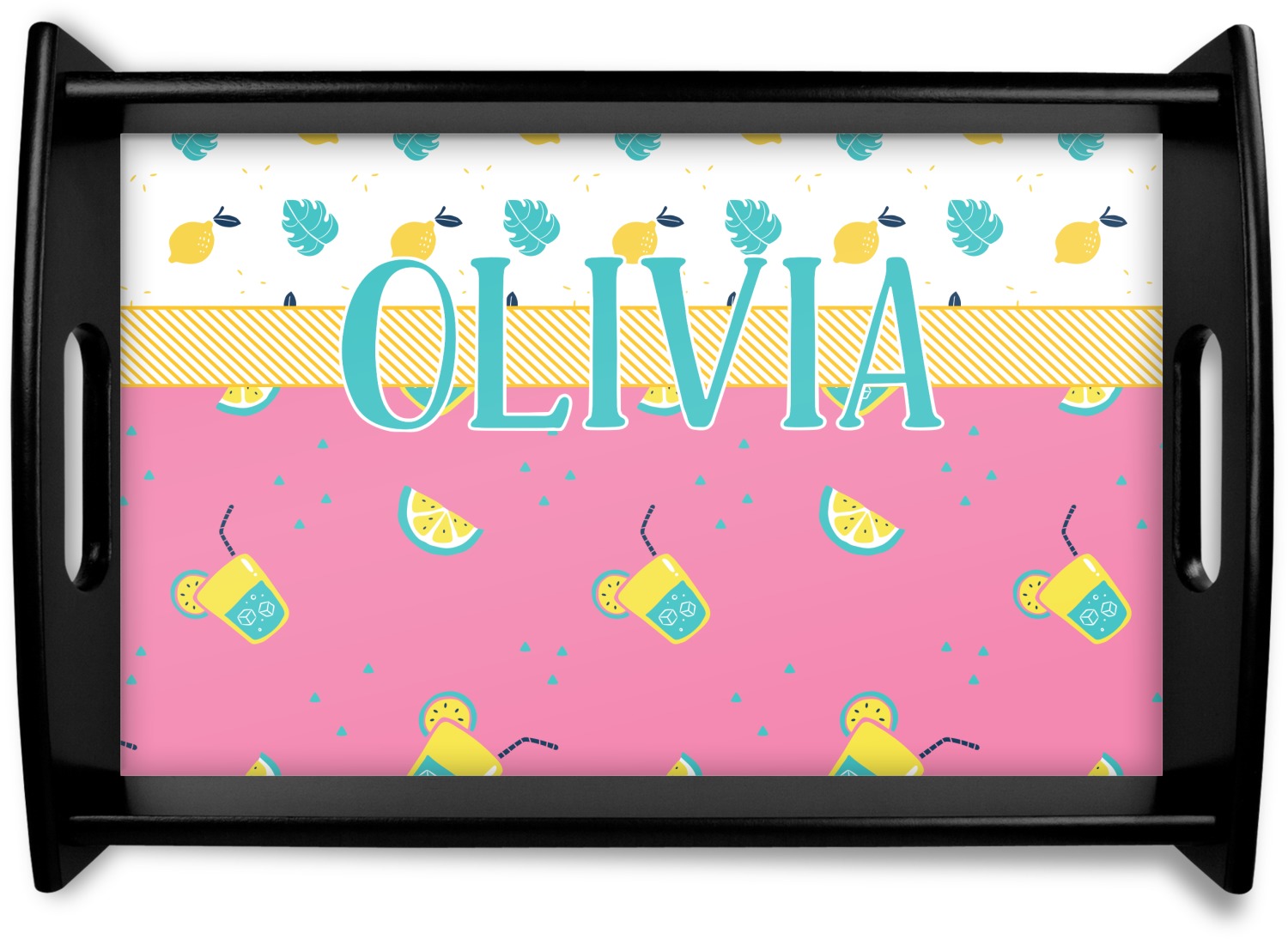 This serving tray with handles features square edges and two rounded sides, creating a very modern look. Each side is fabricated from a beautifully cut, natural wood. The bottom of the interior of the tray displays your customized design in bright, vibrant color. The tray is sold in both a black color and a natural wood look. Each variation of the wood serving tray has two sizes: Small, which is 14" x 10" x 2.25", and Large, which is 19.5" x 13.5" x 2.75".