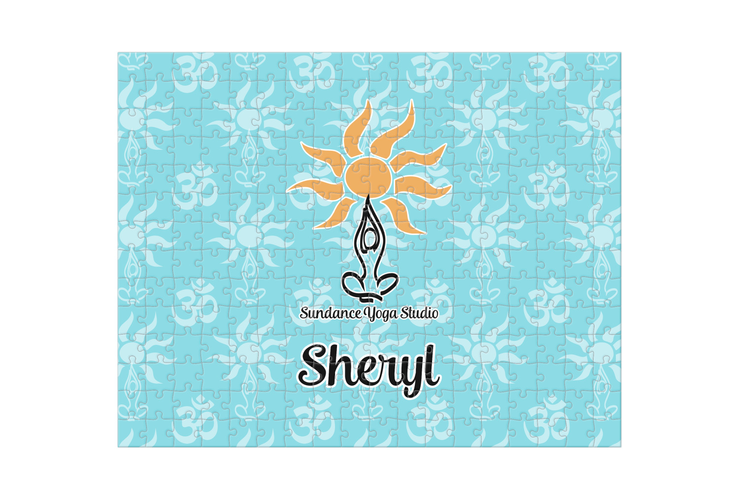 This calming design is dominantly a gorgeous light teal with the the Sundance logo, as well as the om symbol, repeating in the background. The main logo is prominently displayed front and center. The logo is a simple drawing of a figure doing the lotus pose with a sun rising above them. "Sundance Yoga Studio" is written beneath the logo. You personalization goes directly under the logo to create a finished design.