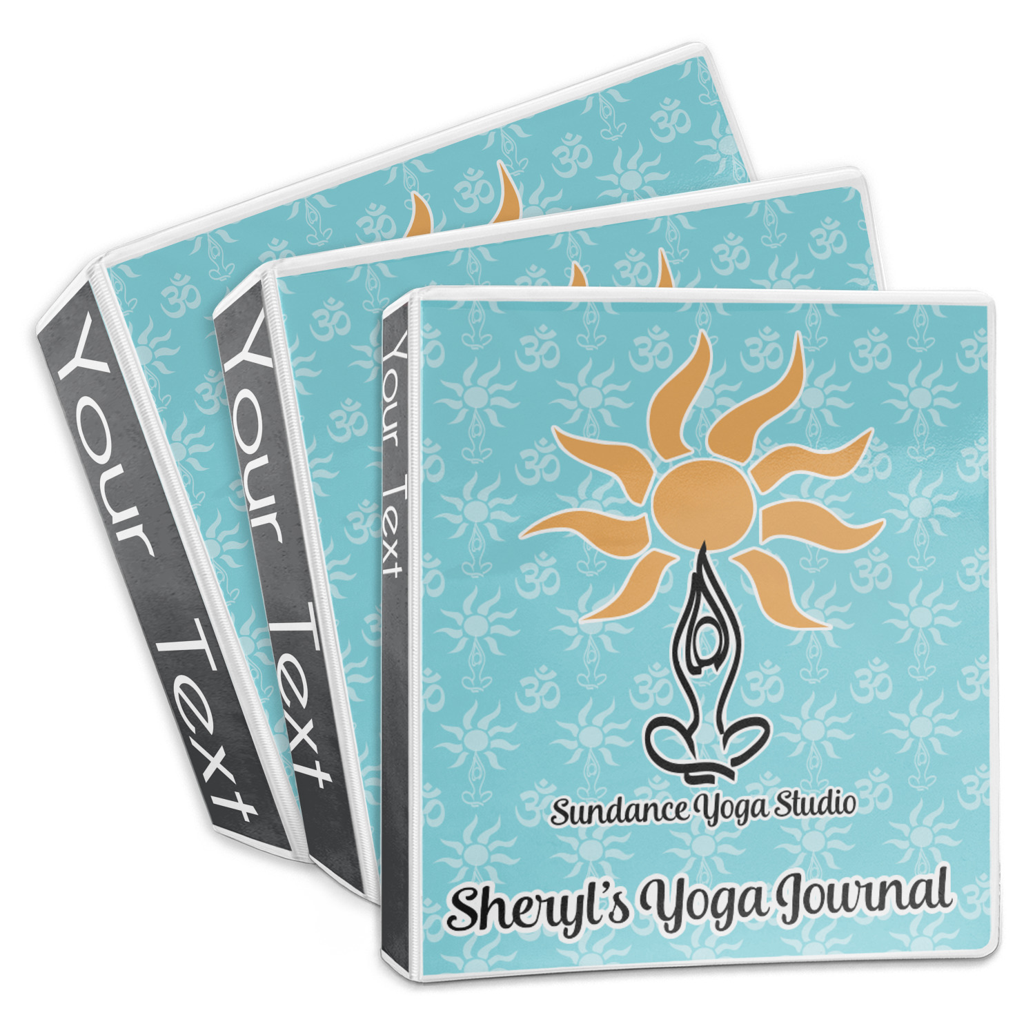 This calming design is dominantly a gorgeous light teal with the the Sundance logo, as well as the om symbol, repeating in the background. The main logo is prominently displayed front and center. The logo is a simple drawing of a figure doing the lotus pose with a sun rising above them. "Sundance Yoga Studio" is written beneath the logo. You personalization goes directly under the logo to create a finished design.