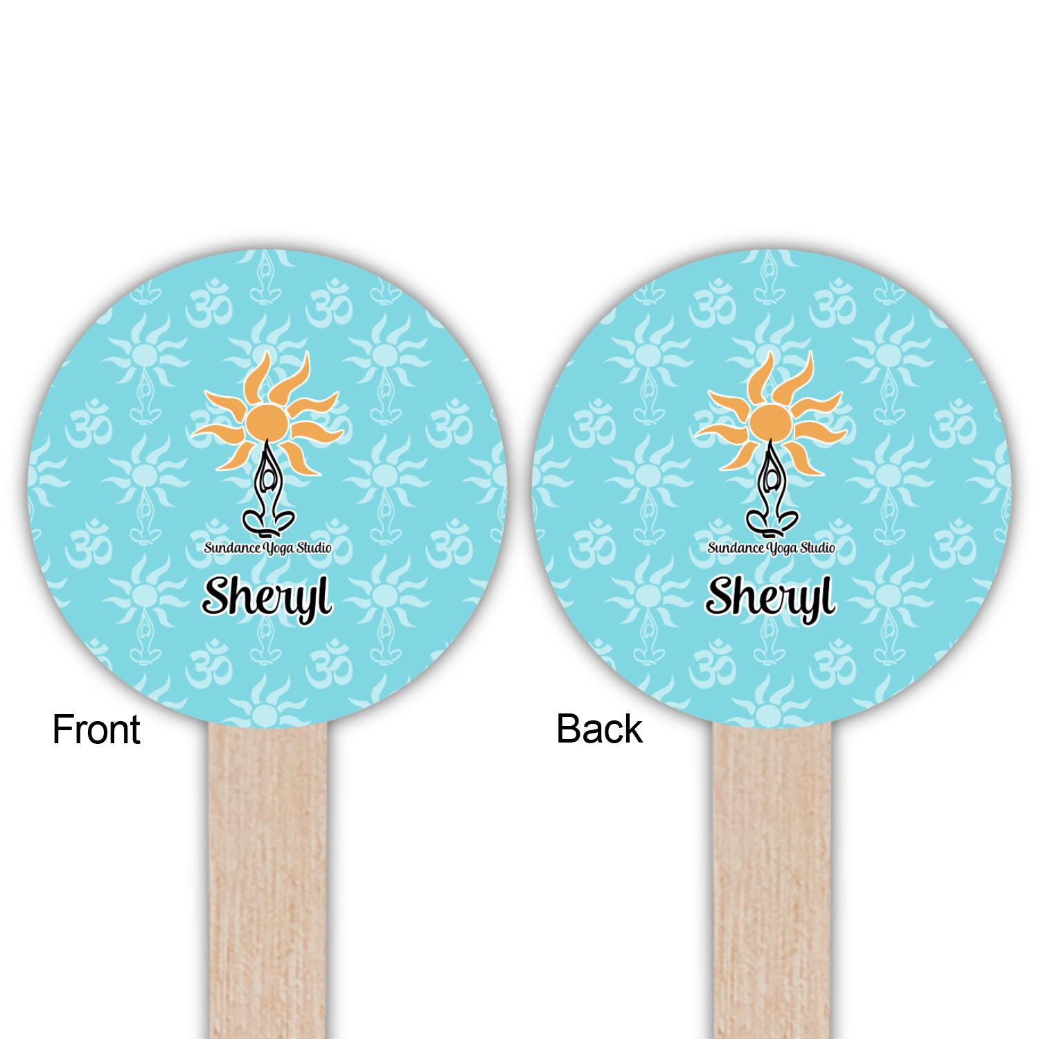 This calming design is dominantly a gorgeous light teal with the the Sundance logo, as well as the om symbol, repeating in the background. The main logo is prominently displayed front and center. The logo is a simple drawing of a figure doing the lotus pose with a sun rising above them. "Sundance Yoga Studio" is written beneath the logo. You personalization goes directly under the logo to create a finished design.