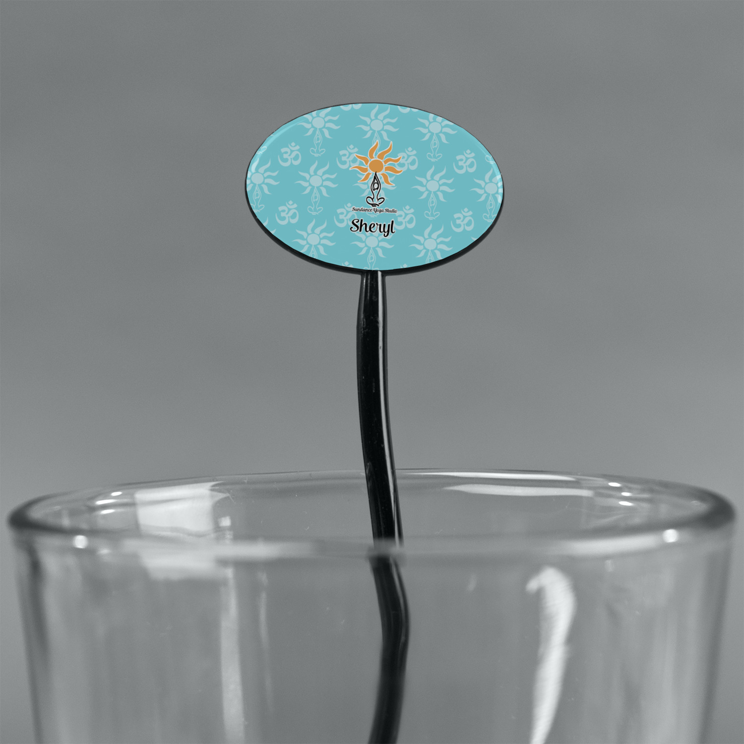 This calming design is dominantly a gorgeous light teal with the the Sundance logo, as well as the om symbol, repeating in the background. The main logo is prominently displayed front and center. The logo is a simple drawing of a figure doing the lotus pose with a sun rising above them. "Sundance Yoga Studio" is written beneath the logo. You personalization goes directly under the logo to create a finished design.
