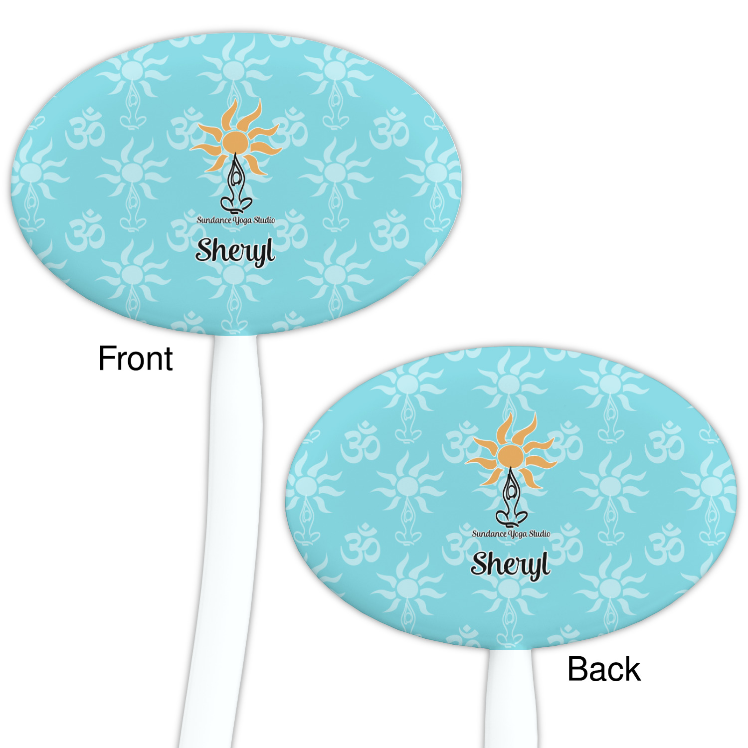 This calming design is dominantly a gorgeous light teal with the the Sundance logo, as well as the om symbol, repeating in the background. The main logo is prominently displayed front and center. The logo is a simple drawing of a figure doing the lotus pose with a sun rising above them. "Sundance Yoga Studio" is written beneath the logo. You personalization goes directly under the logo to create a finished design.