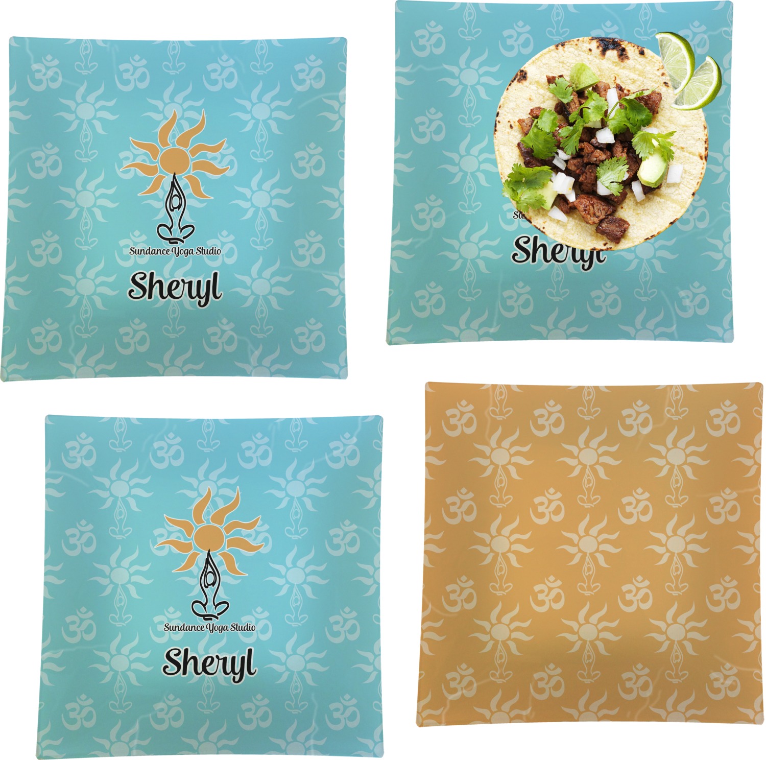 This calming design is dominantly a gorgeous light teal with the the Sundance logo, as well as the om symbol, repeating in the background. The main logo is prominently displayed front and center. The logo is a simple drawing of a figure doing the lotus pose with a sun rising above them. "Sundance Yoga Studio" is written beneath the logo. You personalization goes directly under the logo to create a finished design.