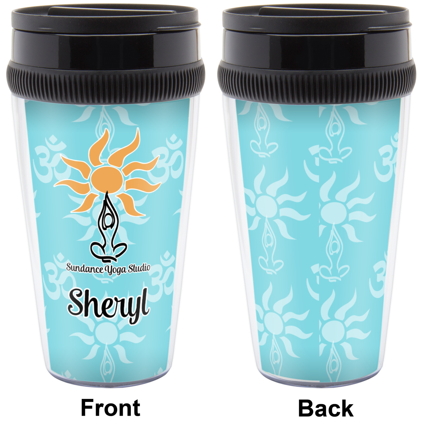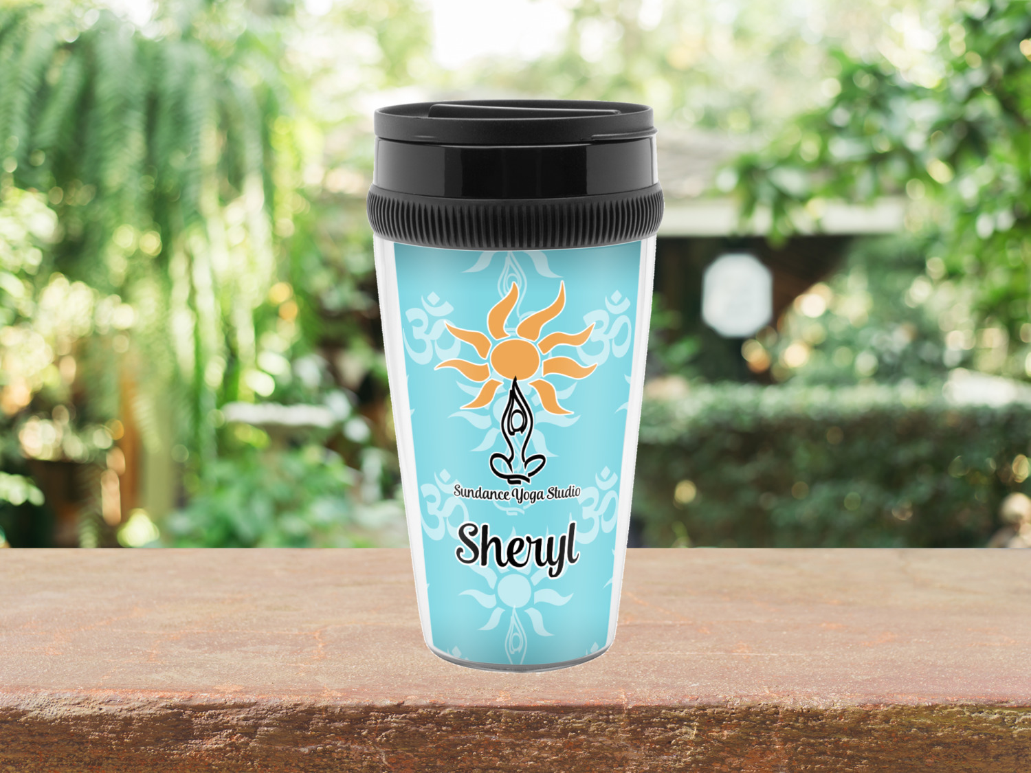 This calming design is dominantly a gorgeous light teal with the the Sundance logo, as well as the om symbol, repeating in the background. The main logo is prominently displayed front and center. The logo is a simple drawing of a figure doing the lotus pose with a sun rising above them. "Sundance Yoga Studio" is written beneath the logo. You personalization goes directly under the logo to create a finished design.