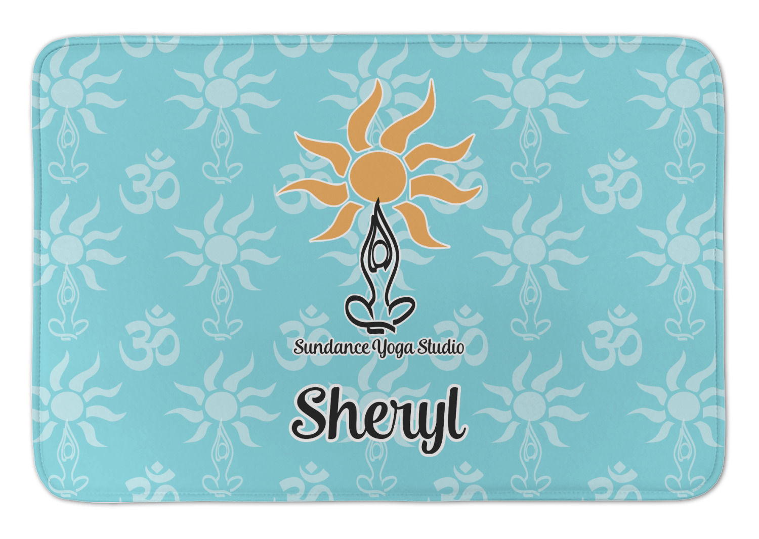 This calming design is dominantly a gorgeous light teal with the the Sundance logo, as well as the om symbol, repeating in the background. The main logo is prominently displayed front and center. The logo is a simple drawing of a figure doing the lotus pose with a sun rising above them. "Sundance Yoga Studio" is written beneath the logo. You personalization goes directly under the logo to create a finished design.