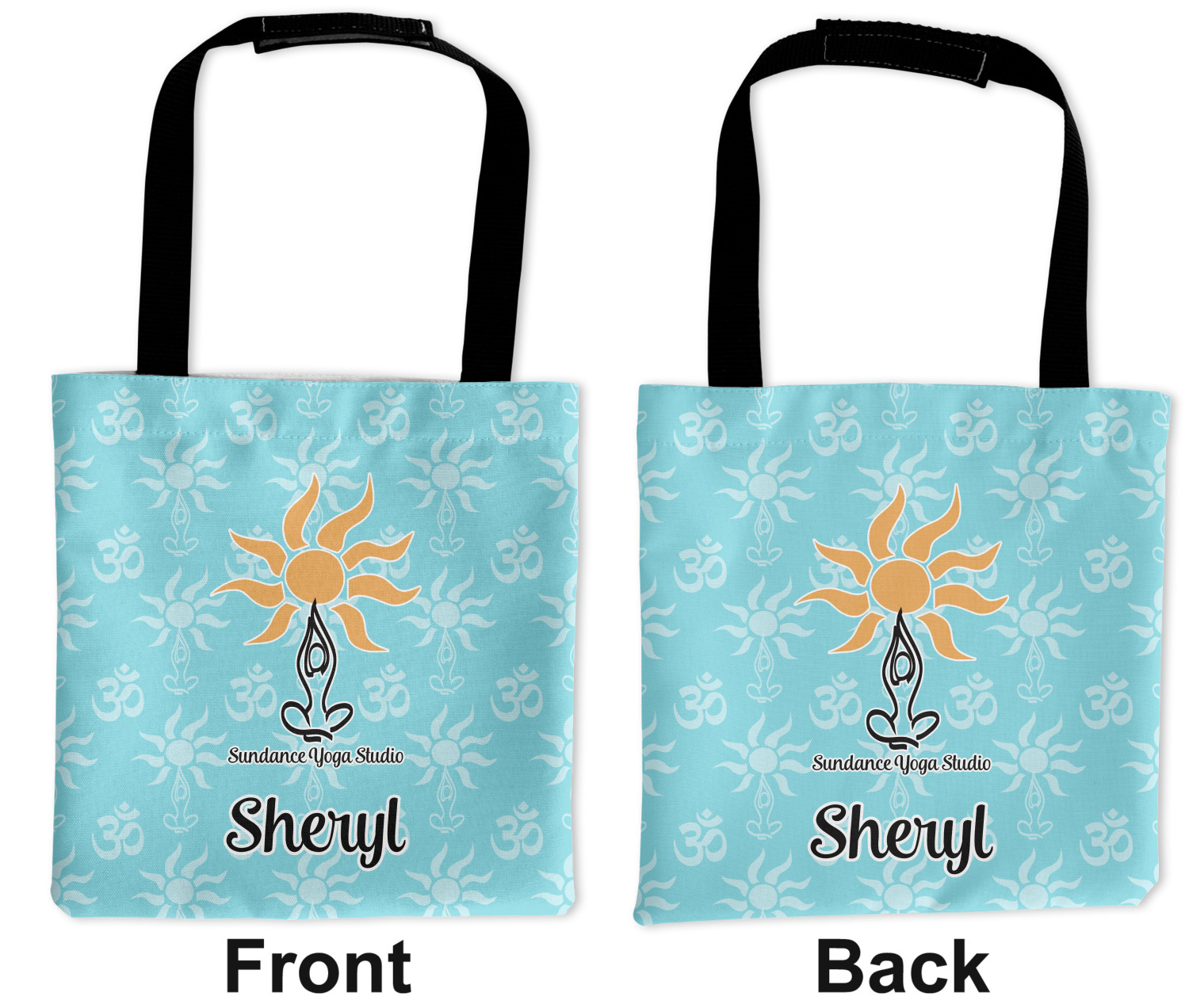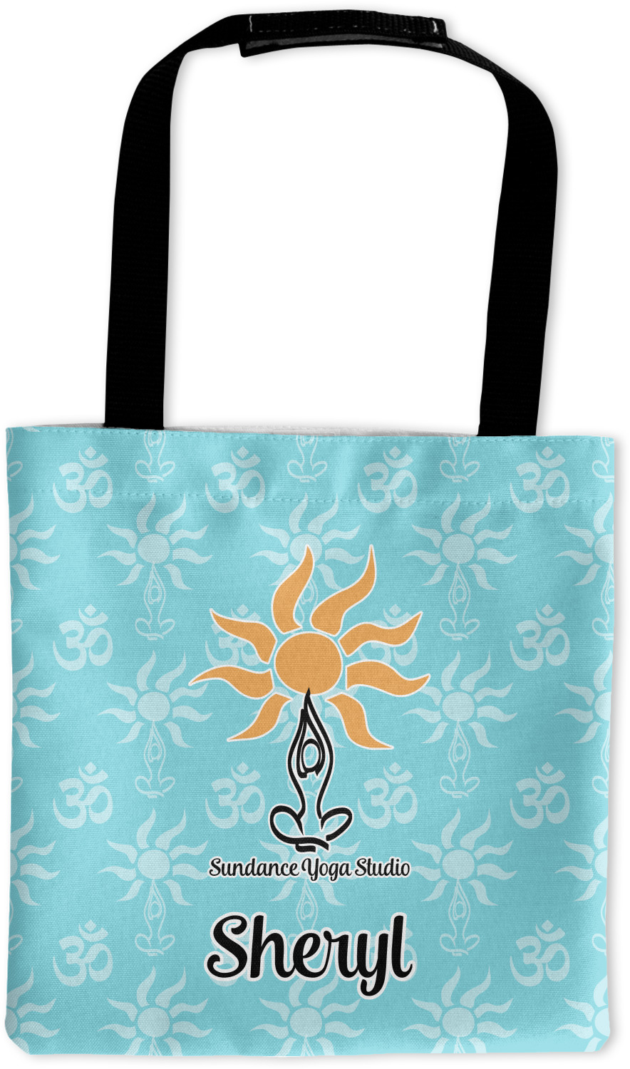 This calming design is dominantly a gorgeous light teal with the the Sundance logo, as well as the om symbol, repeating in the background. The main logo is prominently displayed front and center. The logo is a simple drawing of a figure doing the lotus pose with a sun rising above them. "Sundance Yoga Studio" is written beneath the logo. You personalization goes directly under the logo to create a finished design.