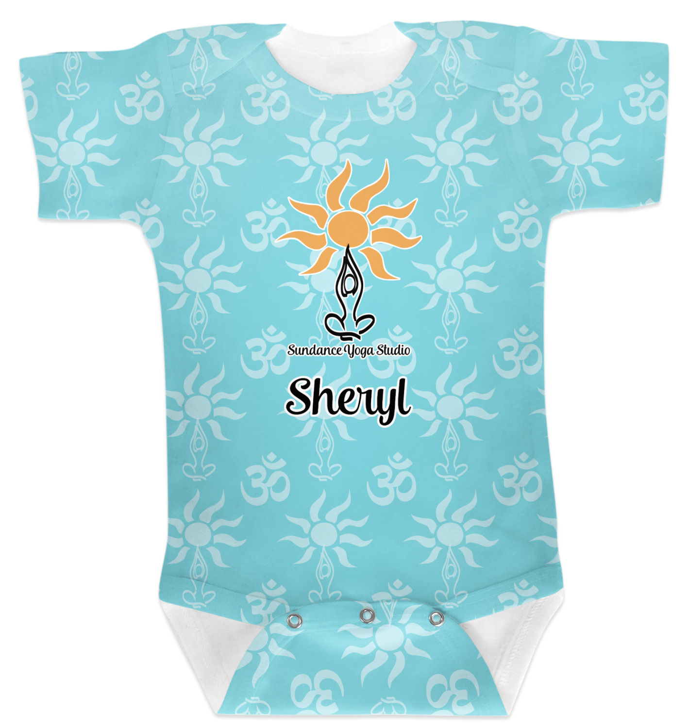This calming design is dominantly a gorgeous light teal with the the Sundance logo, as well as the om symbol, repeating in the background. The main logo is prominently displayed front and center. The logo is a simple drawing of a figure doing the lotus pose with a sun rising above them. "Sundance Yoga Studio" is written beneath the logo. You personalization goes directly under the logo to create a finished design.