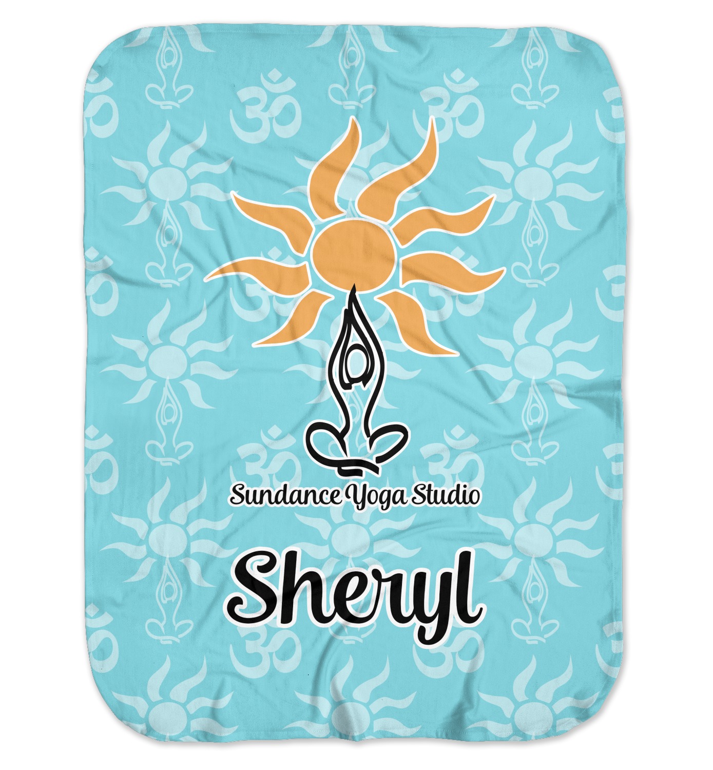 This calming design is dominantly a gorgeous light teal with the the Sundance logo, as well as the om symbol, repeating in the background. The main logo is prominently displayed front and center. The logo is a simple drawing of a figure doing the lotus pose with a sun rising above them. "Sundance Yoga Studio" is written beneath the logo. You personalization goes directly under the logo to create a finished design.