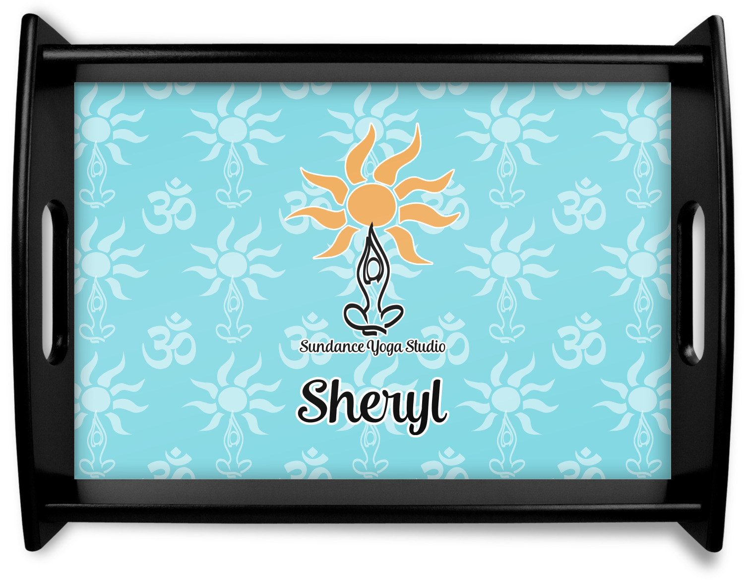 This serving tray with handles features square edges and two rounded sides, creating a very modern look. Each side is fabricated from a beautifully cut, natural wood. The bottom of the interior of the tray displays your customized design in bright, vibrant color. The tray is sold in both a black color and a natural wood look. Each variation of the wood serving tray has two sizes: Small, which is 14" x 10" x 2.25", and Large, which is 19.5" x 13.5" x 2.75".