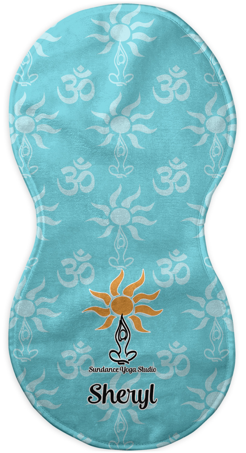 This calming design is dominantly a gorgeous light teal with the the Sundance logo, as well as the om symbol, repeating in the background. The main logo is prominently displayed front and center. The logo is a simple drawing of a figure doing the lotus pose with a sun rising above them. "Sundance Yoga Studio" is written beneath the logo. You personalization goes directly under the logo to create a finished design.