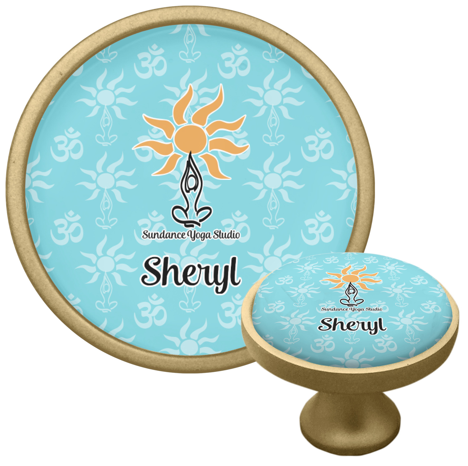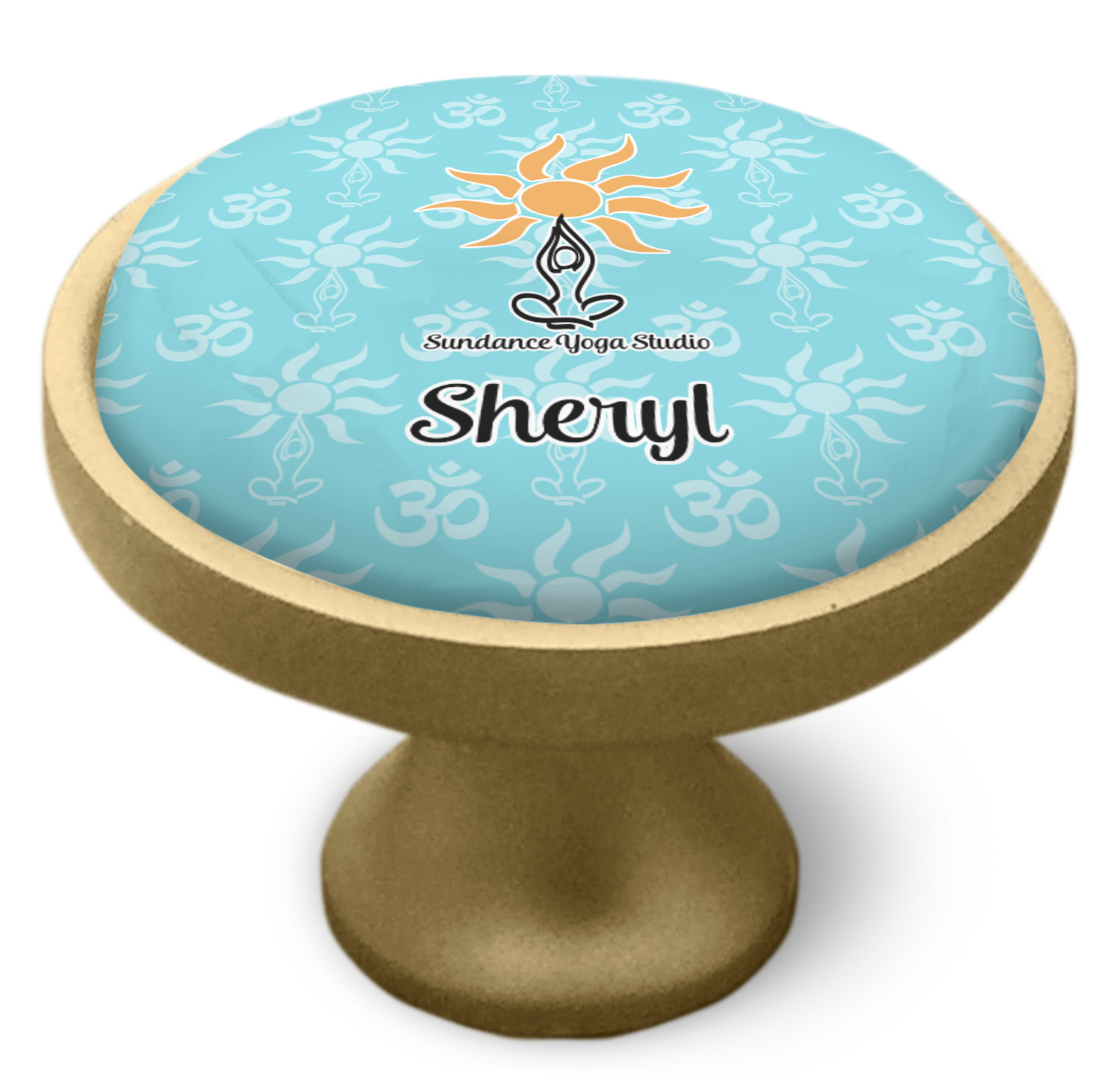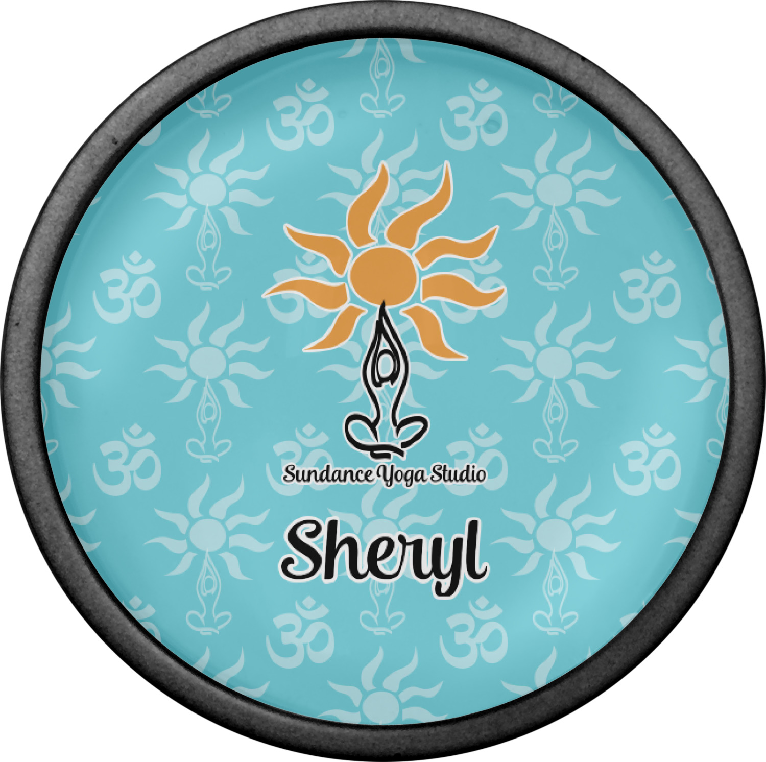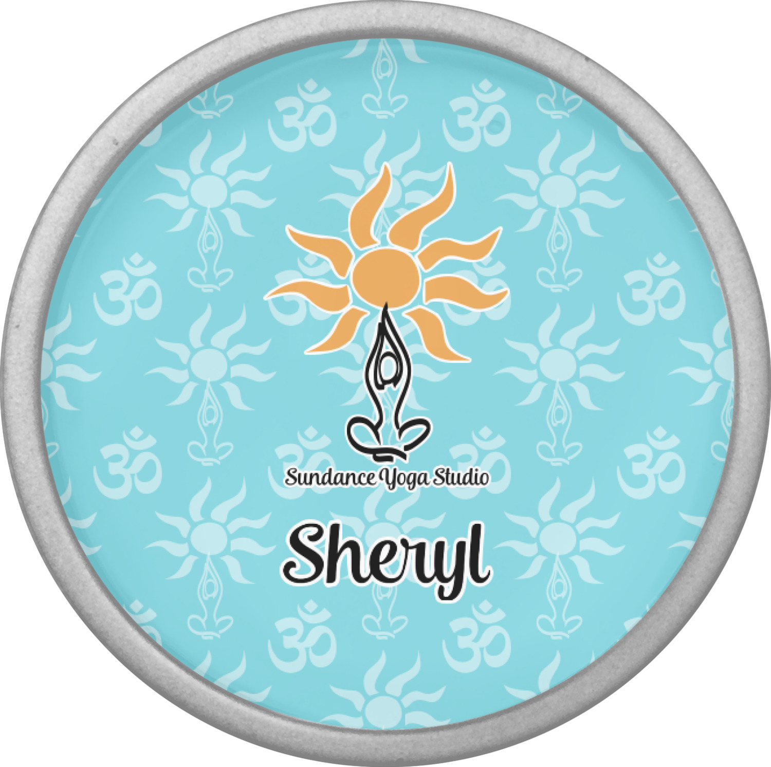This calming design is dominantly a gorgeous light teal with the the Sundance logo, as well as the om symbol, repeating in the background. The main logo is prominently displayed front and center. The logo is a simple drawing of a figure doing the lotus pose with a sun rising above them. "Sundance Yoga Studio" is written beneath the logo. You personalization goes directly under the logo to create a finished design.