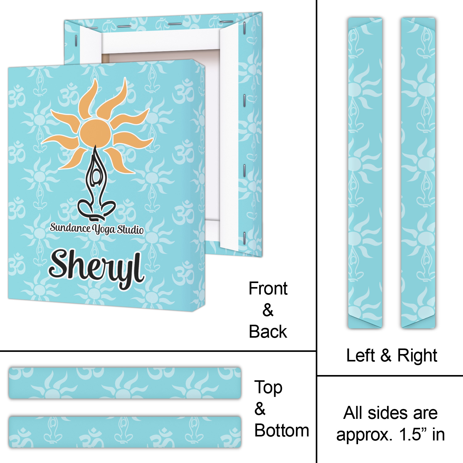 This calming design is dominantly a gorgeous light teal with the the Sundance logo, as well as the om symbol, repeating in the background. The main logo is prominently displayed front and center. The logo is a simple drawing of a figure doing the lotus pose with a sun rising above them. "Sundance Yoga Studio" is written beneath the logo. You personalization goes directly under the logo to create a finished design.